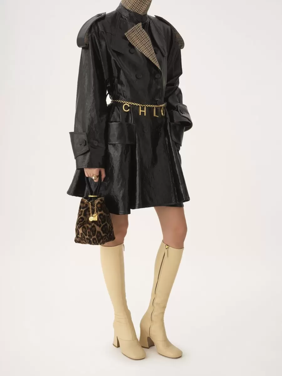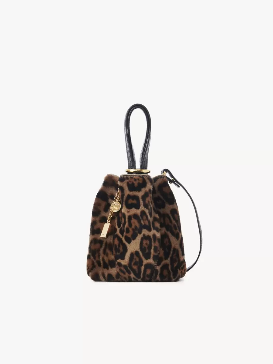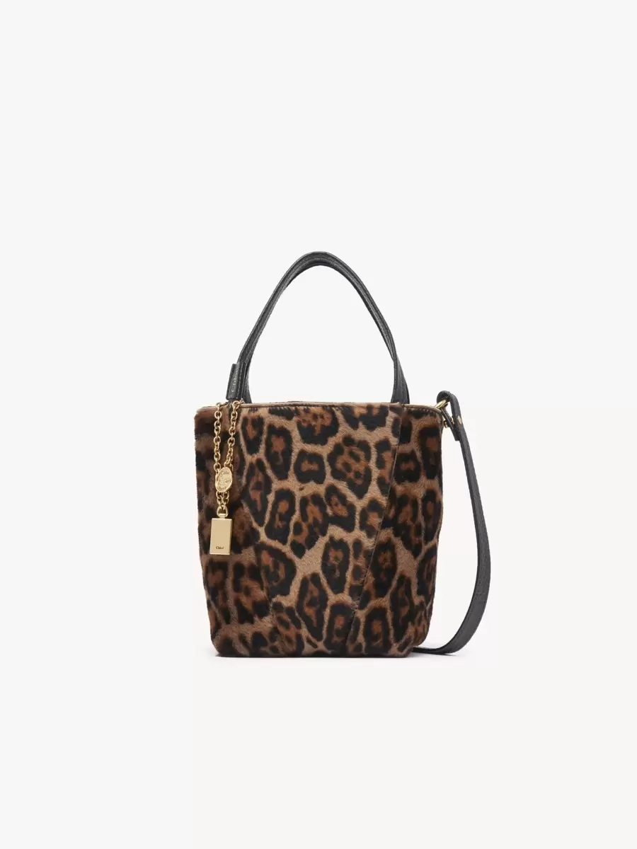 Crafted from leopard-print shearling, the small Chloé Spin tote bag has a minimalist silhouette elevated with graphic lines. A dangling chain features the Maison’s signature Chloé and Horse Medals.