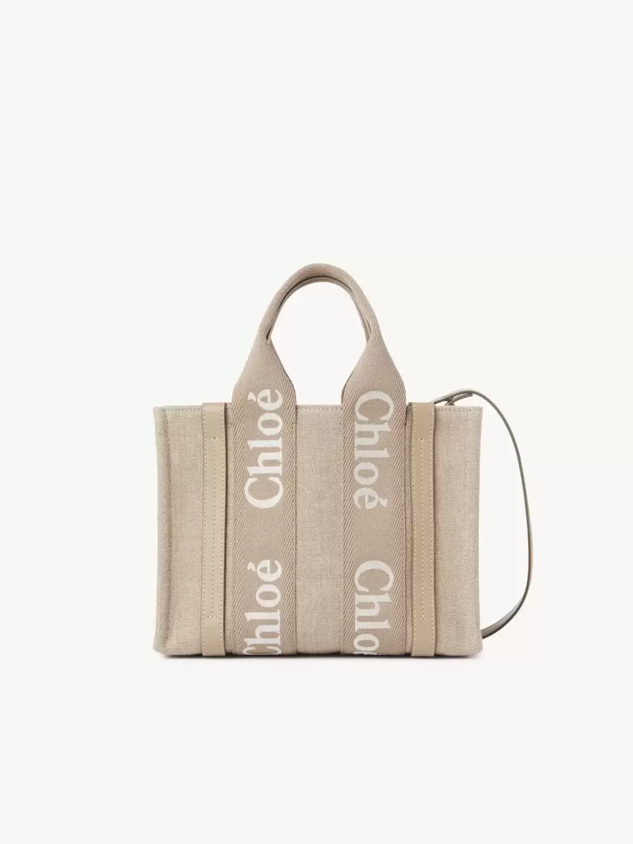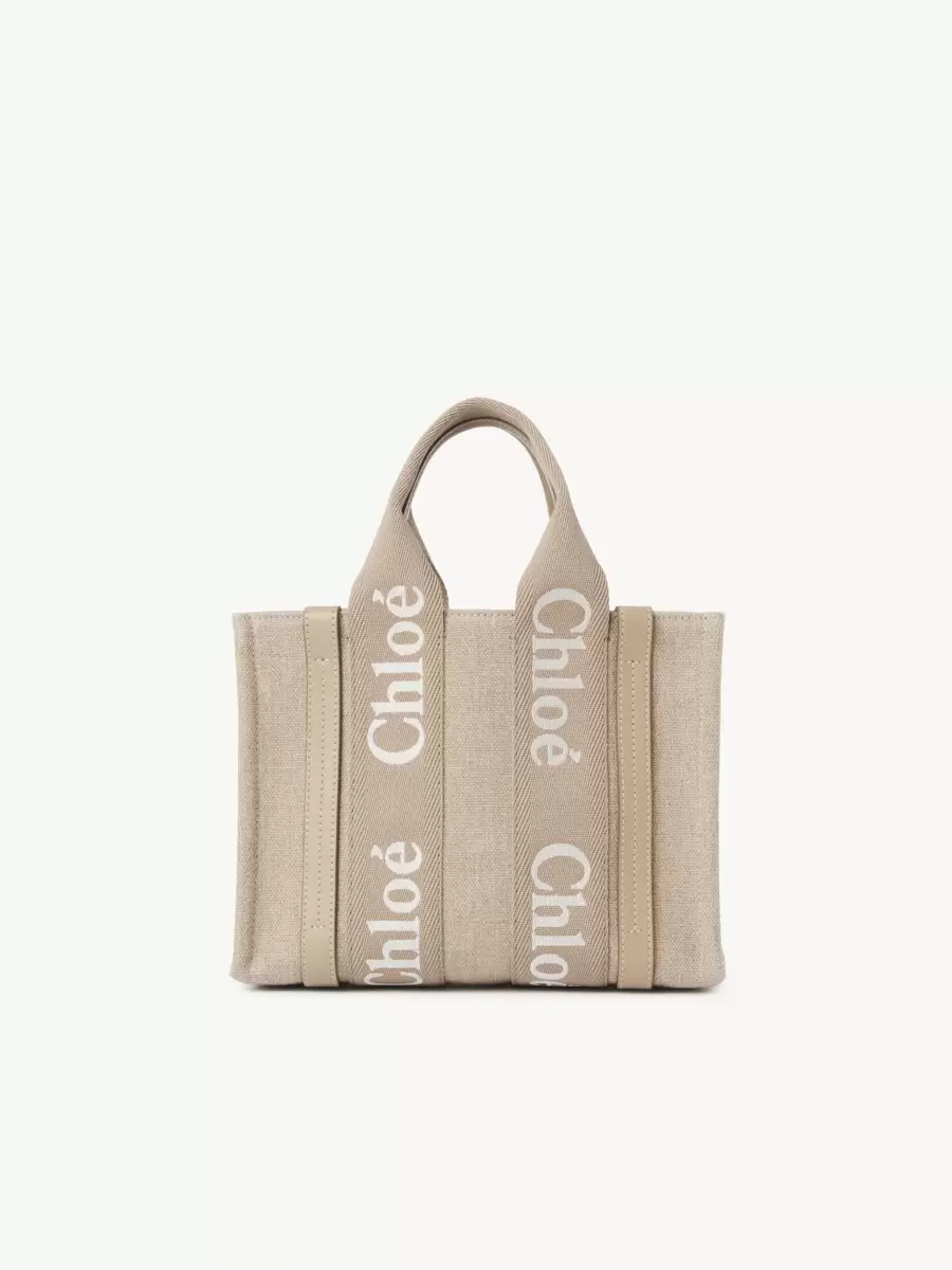This small Woody tote bag is crafted from linen canvas, elevated by contrasting vertical strips in shiny calfskin and signature canvas ribbons embroidered with the Chloé logo.