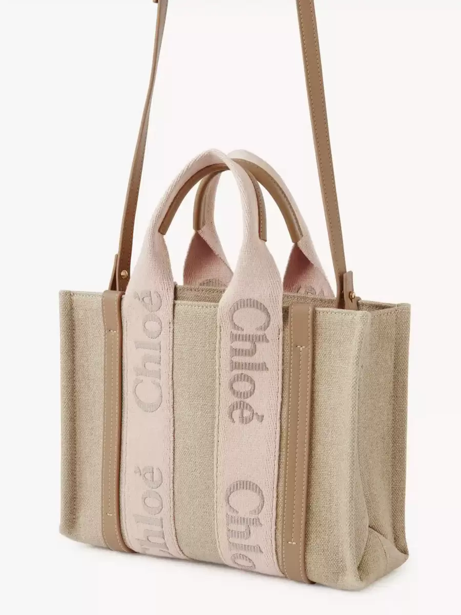 Crafted from linen canvas detailed with shiny calfskin strips, this small Woody tote bag is a soft day bag with a long, removable strap in addition to the top handles. The roomy inside compartment includes a practical flat pocket in leather for an elevated touch. Linen lining matches a refined finish with a lower environmental impact.