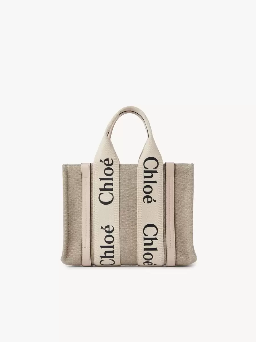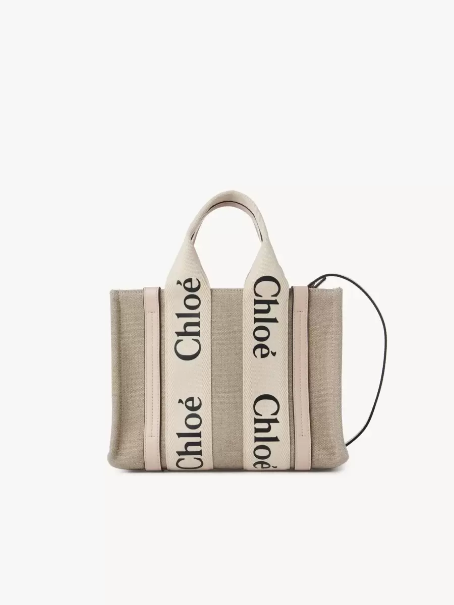 Crafted from linen canvas detailed with shiny calfskin strips, this small Woody tote bag is a soft day bag with a removable long strap in addition to the top handles. The roomy inside compartment is unlined and includes a practical flat pocket in leather for an elevated touch. Carry this versatile small bag on the arm, shoulder or cross-body.