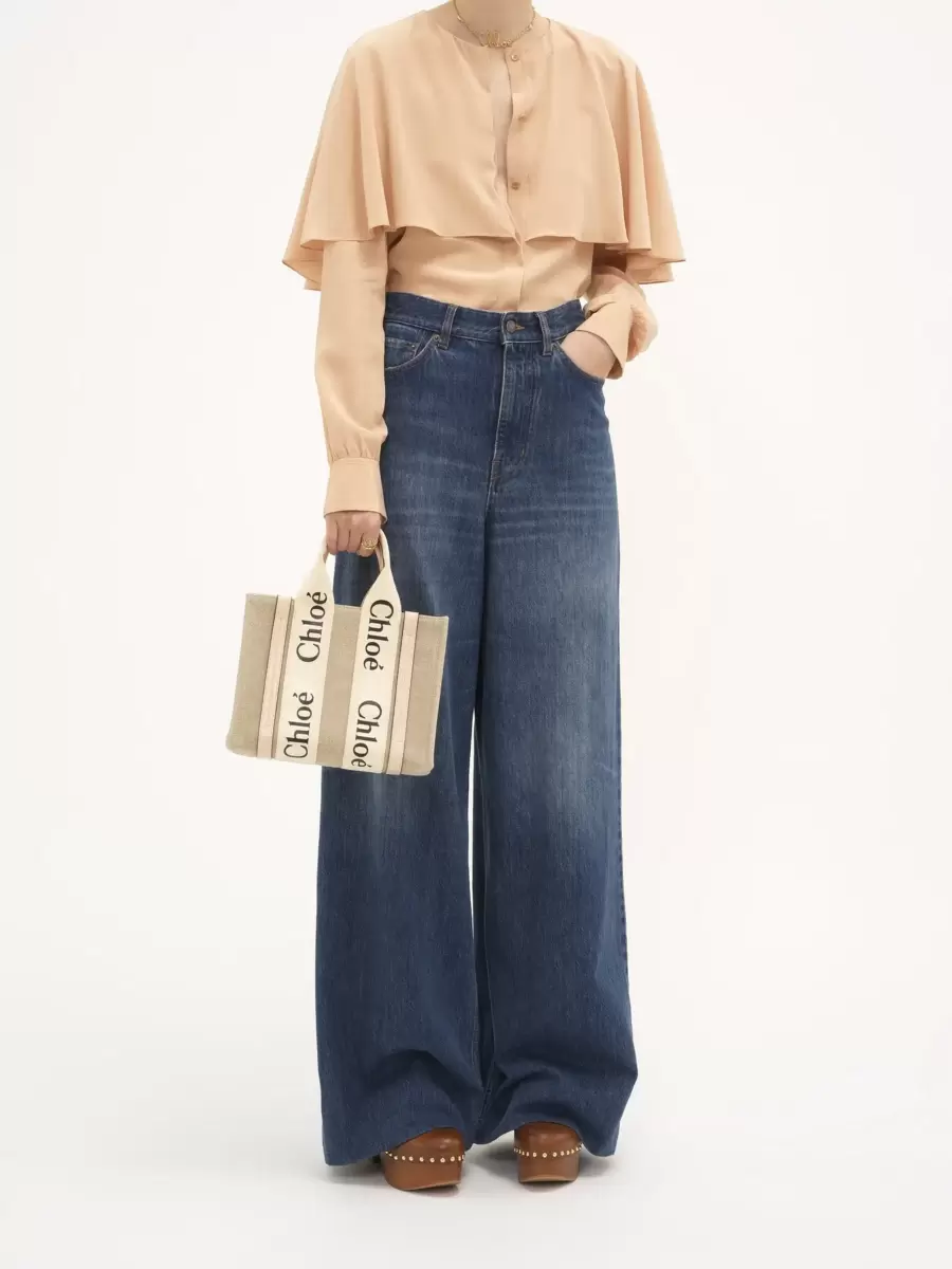 The Woody bag’s modern lines are emphasized by the contrasting vertical leather strips and the signature Chloé logo ribbon carried over from the Maison’s Woody mule.