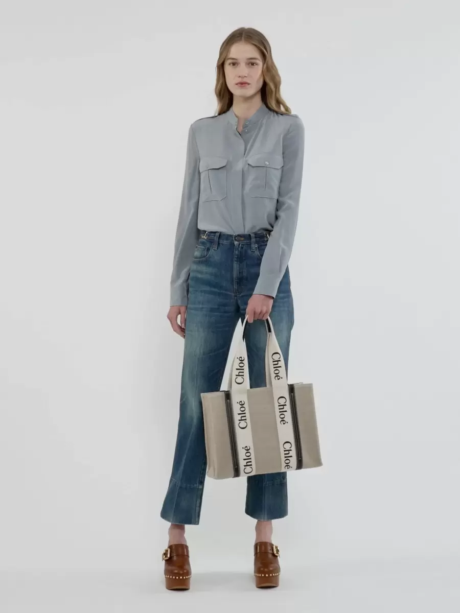 Tote bag in linen canvas & shiny calfskin with Chloé logo
