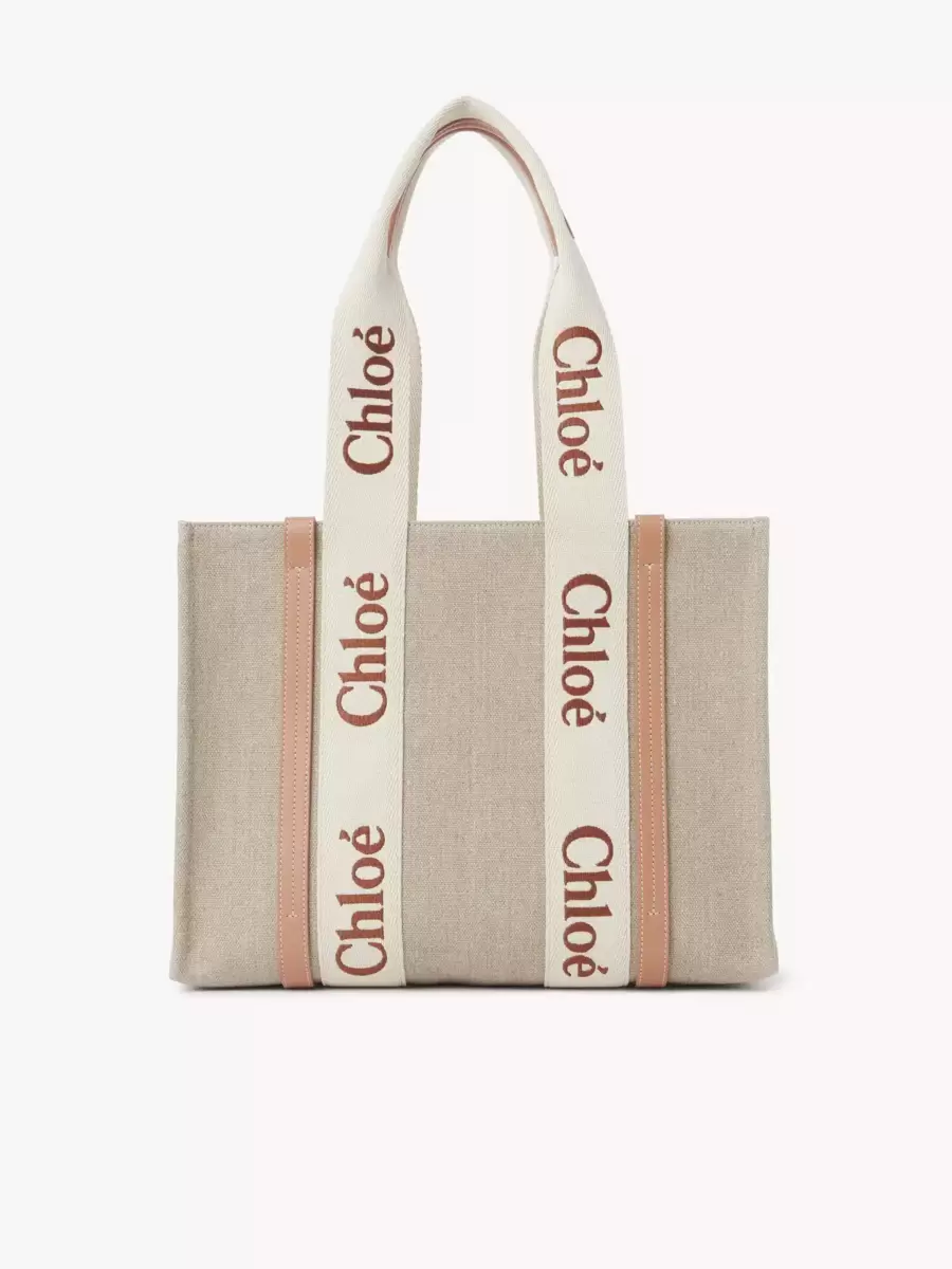 Woody tote bag in linen canvas, calfskin & webbing with Chloé logo embroidery