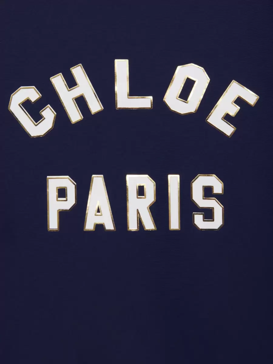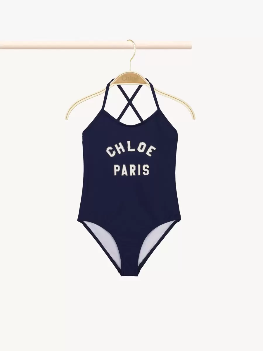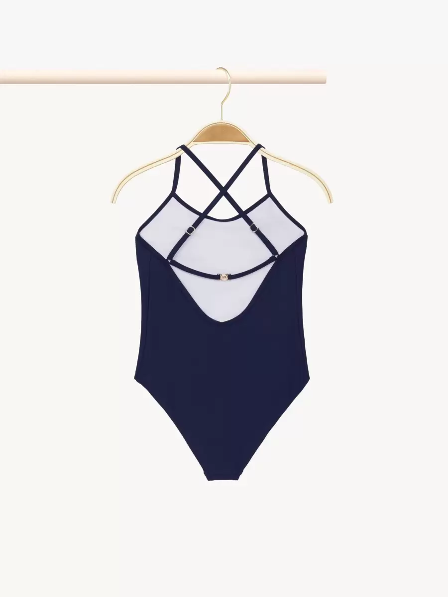 This one-piece swimsuit has thin straps that cross over at the back. A large Chloé logo print with a gold-tone border embellishes the front, while a gold-tone clasp fastens the back.