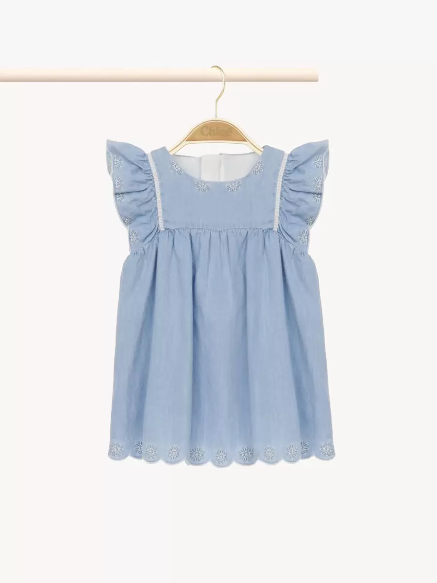 Detailed with flouncy sleeves and a scalloped hem, the baby dress features floral embroidery and jour échelle trims. Chloé logo embroidery signs the chest.