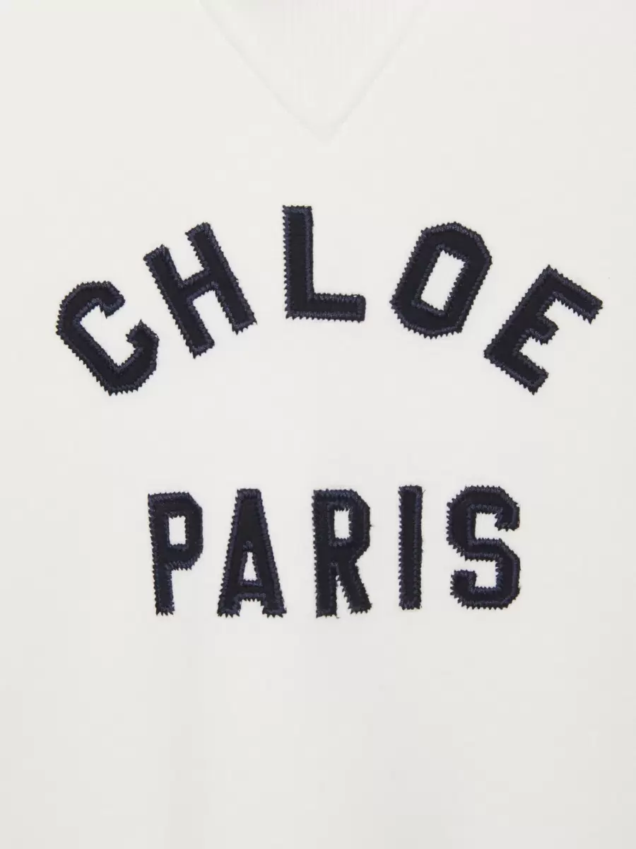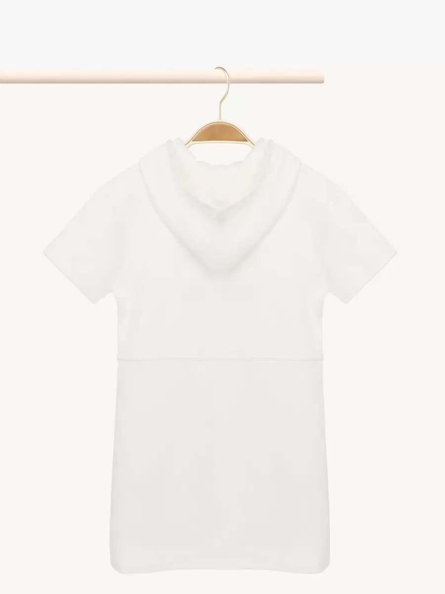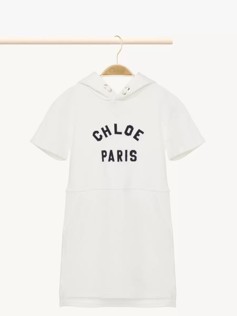 Made from organic cotton fleece, this hooded dress elevates a casual silhouette with contrast Chloé Paris embroidery at the chest. Drawstring detail and gold-tone eyelets adorn the hood, while side pockets enhance the relaxed attitude.