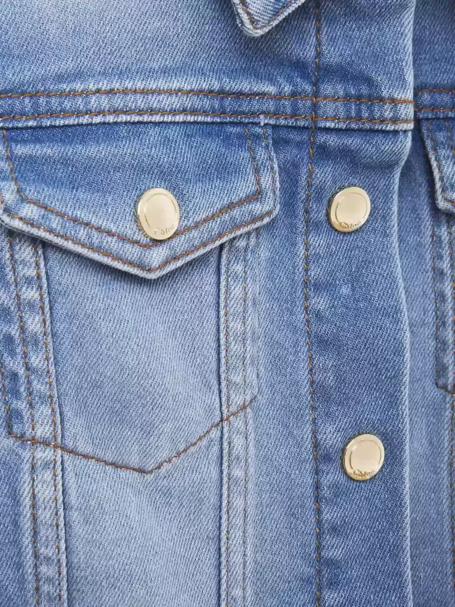 This cotton denim jacket has a faded effect and ochre top-stitching for a city attitude. Gold-toned Chloé-engraved snap buttons run through the front and detail the chest pockets, adding elegant hardware. A Chloé Paris leather logo patch signs the back.