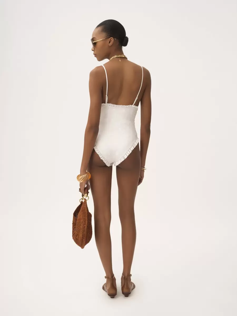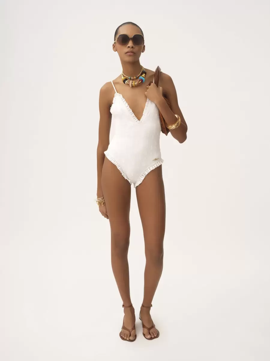 One-piece swimsuit in stretch broderie anglaise, featuring a V-neck, thin straps and ruffle trims. A gold-tone Chloé logo plate signs the left hip.