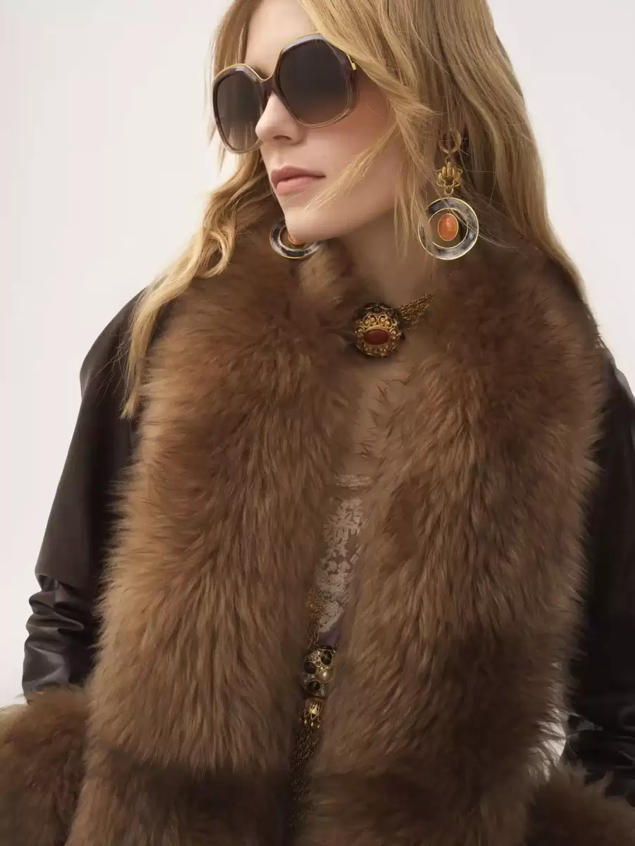 Long column coat in shiny cowhide with contrast shearling trims, a tonal leather belt with decorative, gold-tone hardware, and concealed horn buttons.