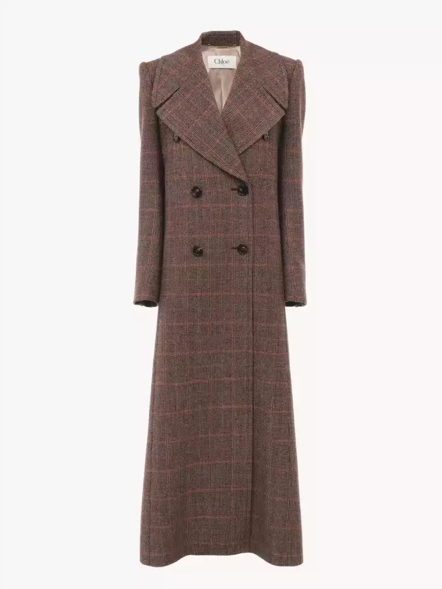 Long double-breasted coat tailored from lower-impact check wool, finished with horn buttons.