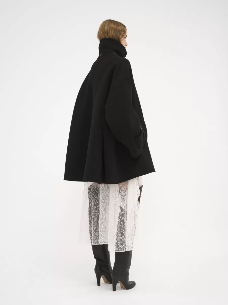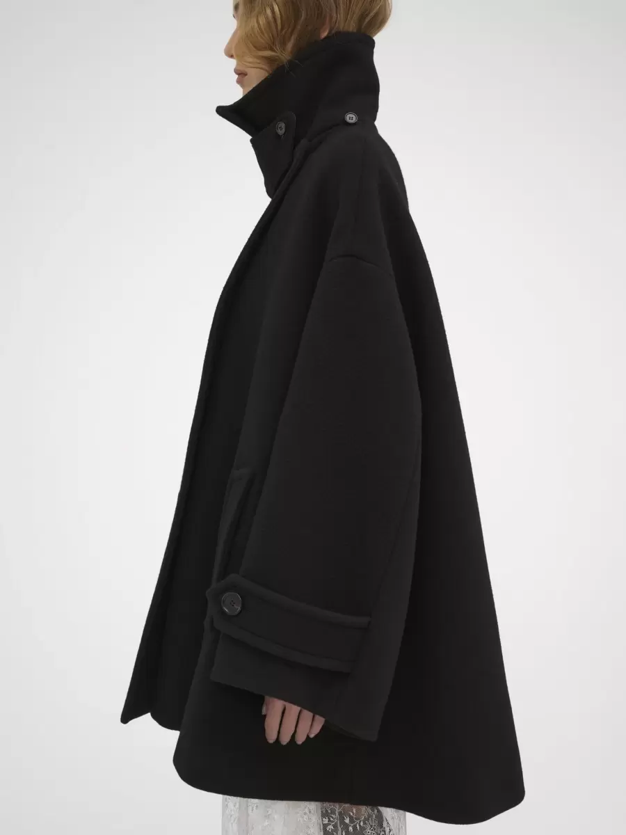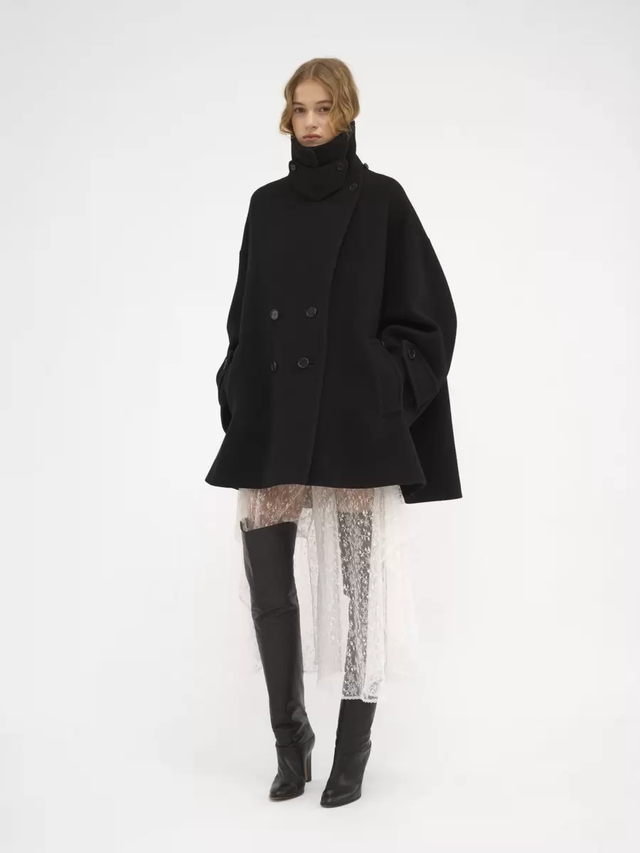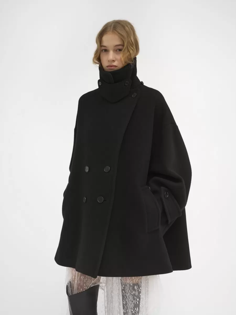 Double-breasted oversized coat in iconic soft wool with a chin-strap collar and horn buttons.