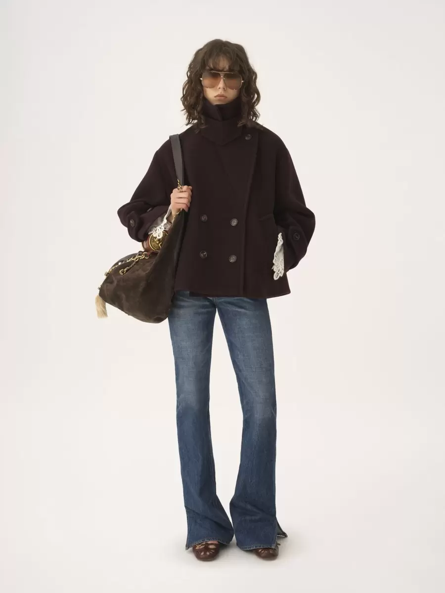 Double-breasted oversized short coat in iconic soft wool with a chin-strap collar and engraved horn buttons.