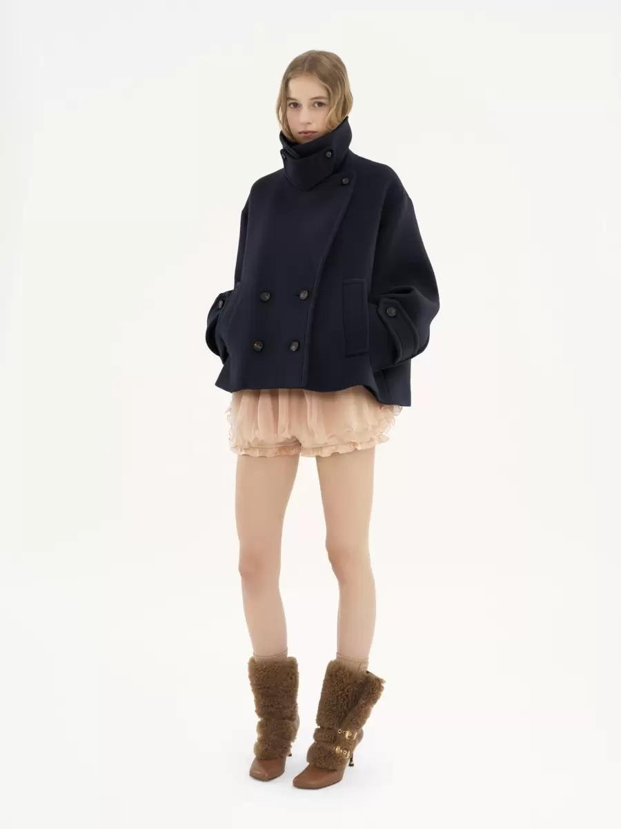 Double-breasted oversized short coat in iconic soft wool with a chin-strap collar and horn buttons.