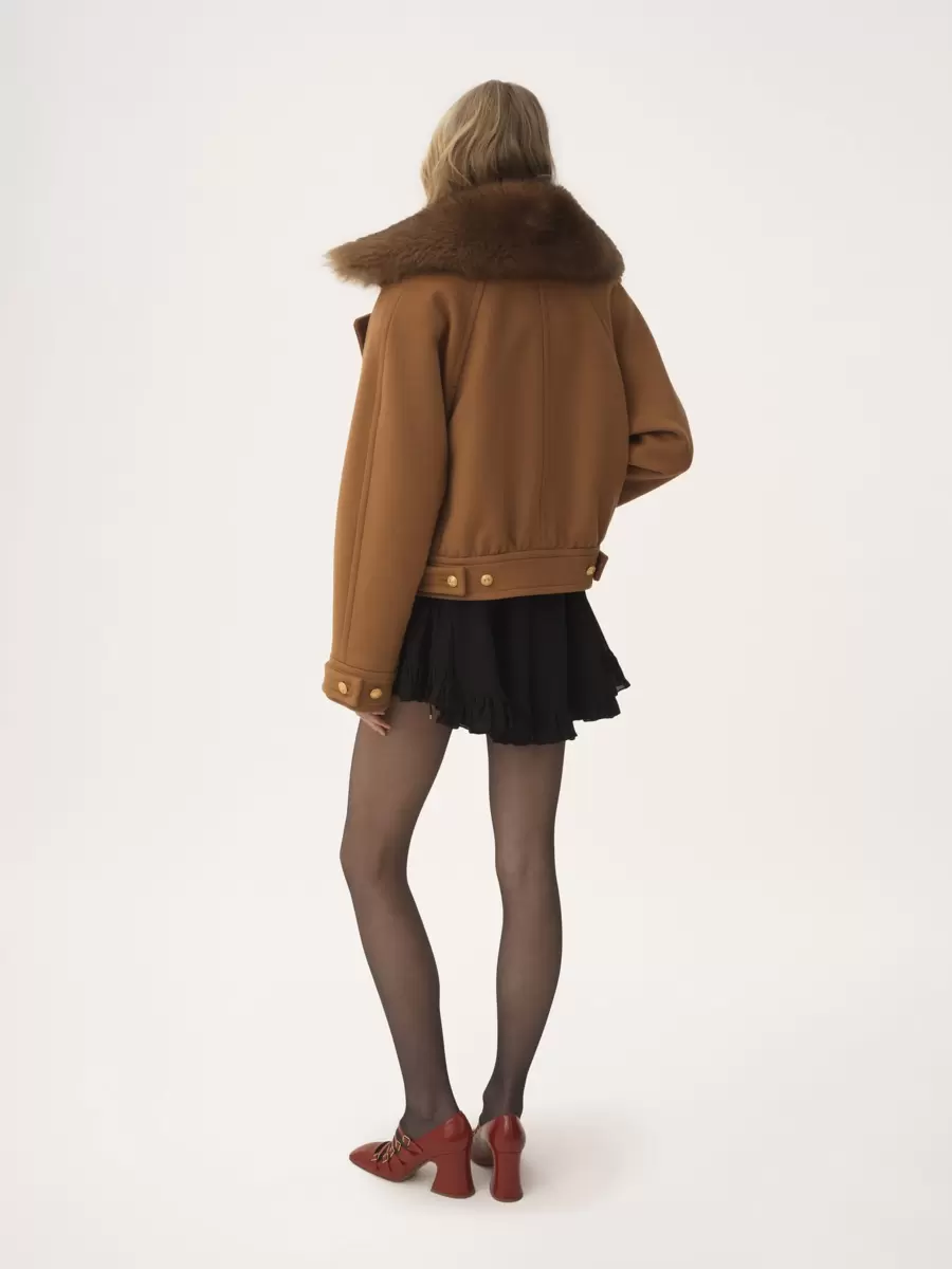 Short boxy double-breasted coat in iconic soft wool, featuring ribbed gold-tone buttons and a removable shearling collar.