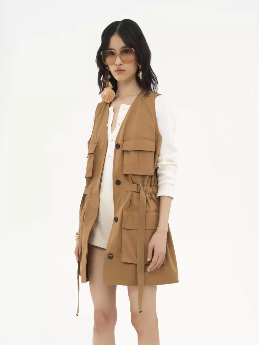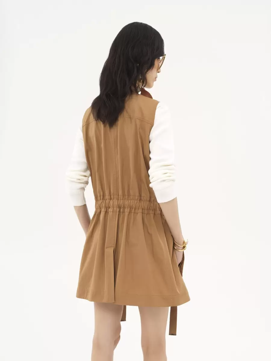 Belted utilitarian vest in light organic cotton gabardine, featuring oversized flap pockets, engraved horn buttons and an integrated belt finished with gold-tone metal tips. A gold metal Chloé logo triangle signs the left pocket.