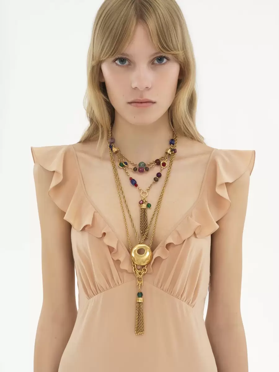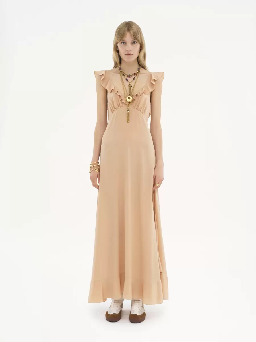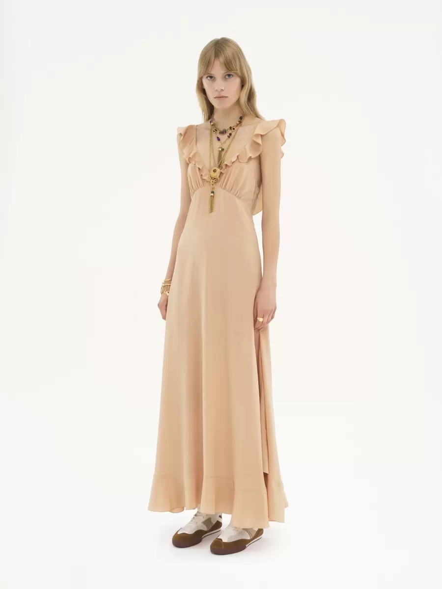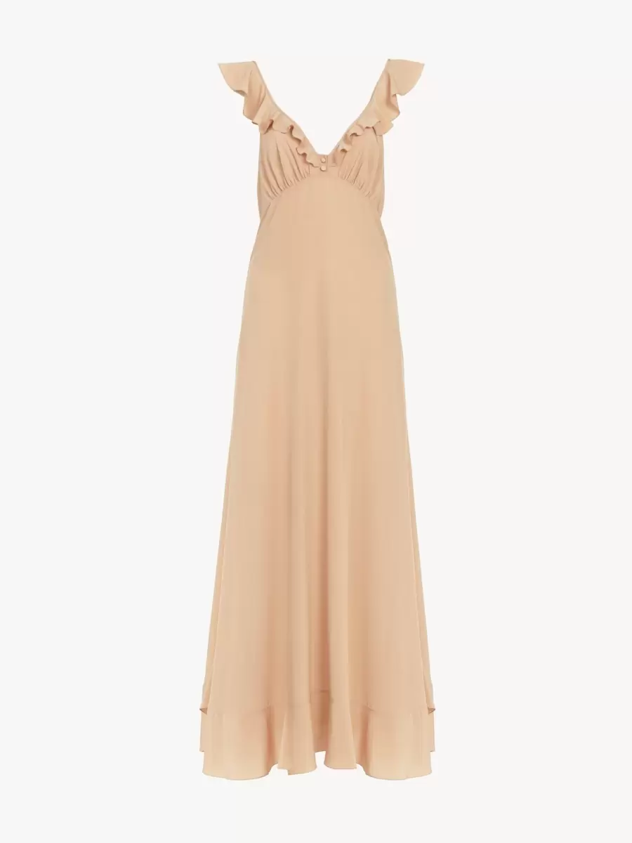 Long sun dress in organic silk crêpe de chine with a fluid, V-neck silhouette, featuring ruffles, gathered details and fabric-covered buttons.