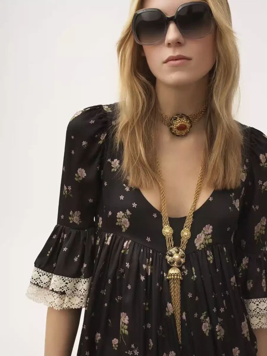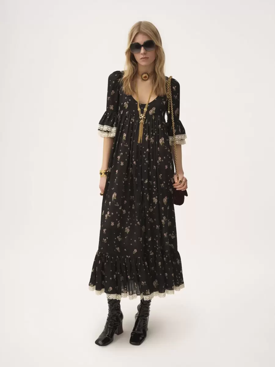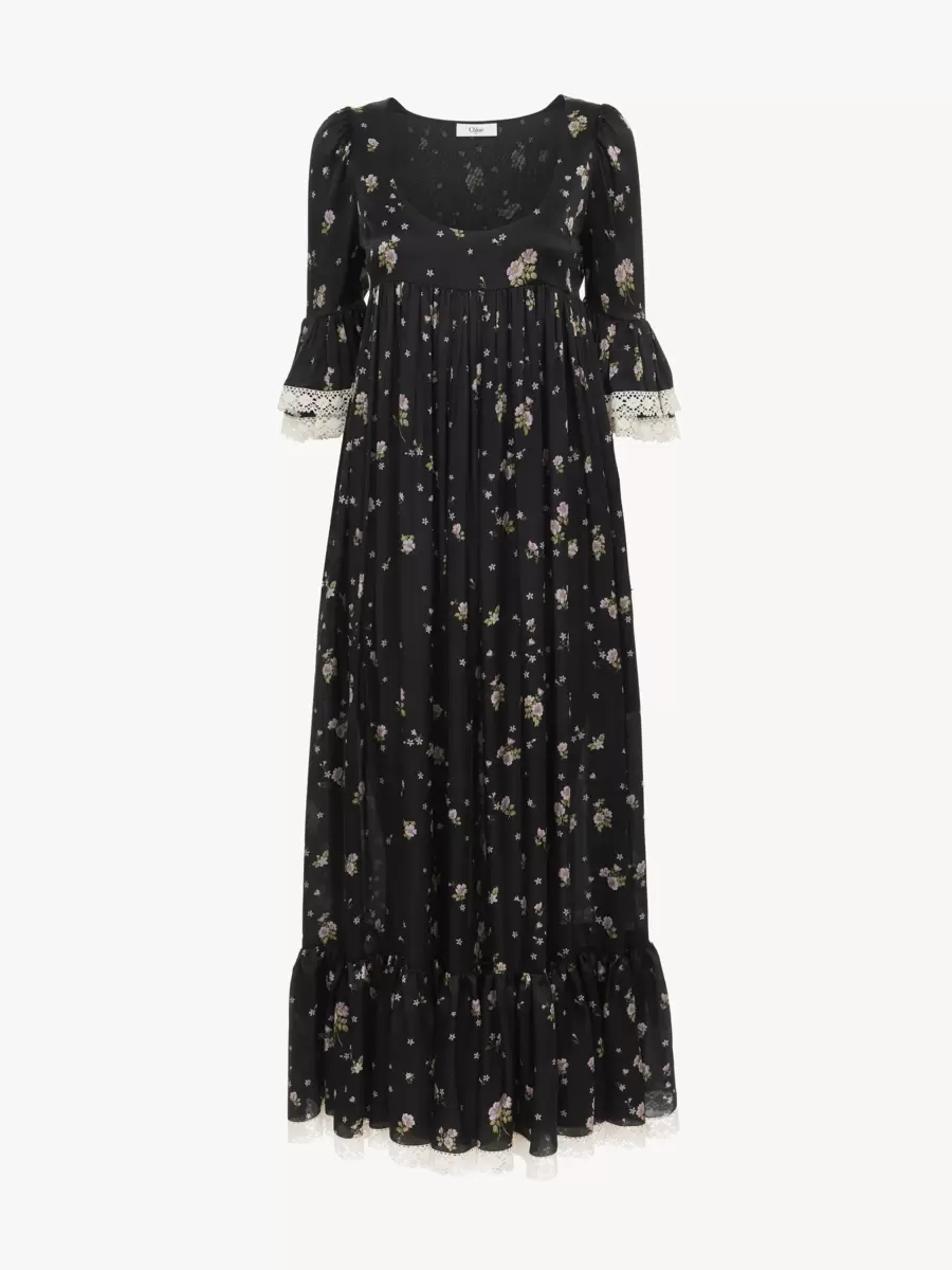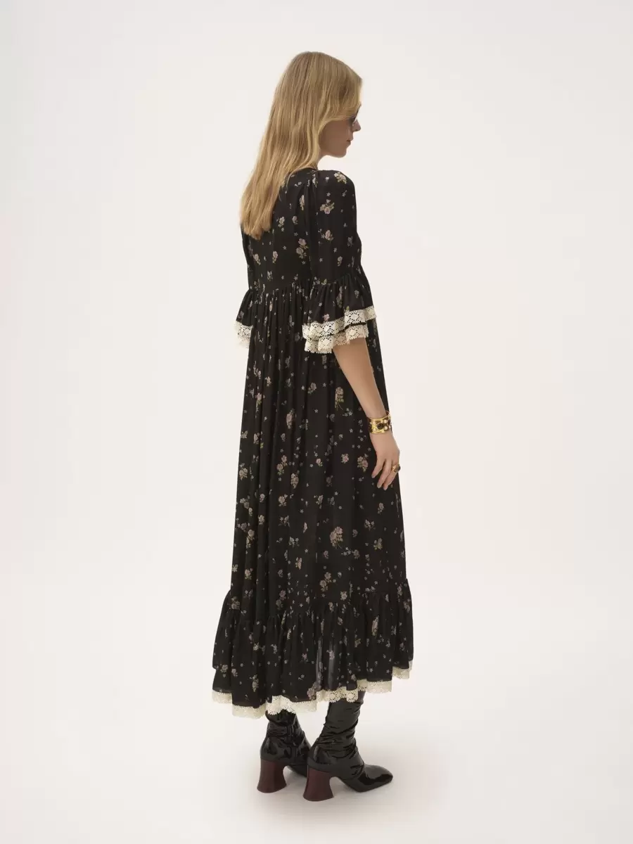 Scoop-neck midi dress in silk charmeuse with an all-over Liberty print and lace trims. The gathered silhouette includes a silk-mix lining, while ruffled trims detail the hem and elbow-length sleeves.