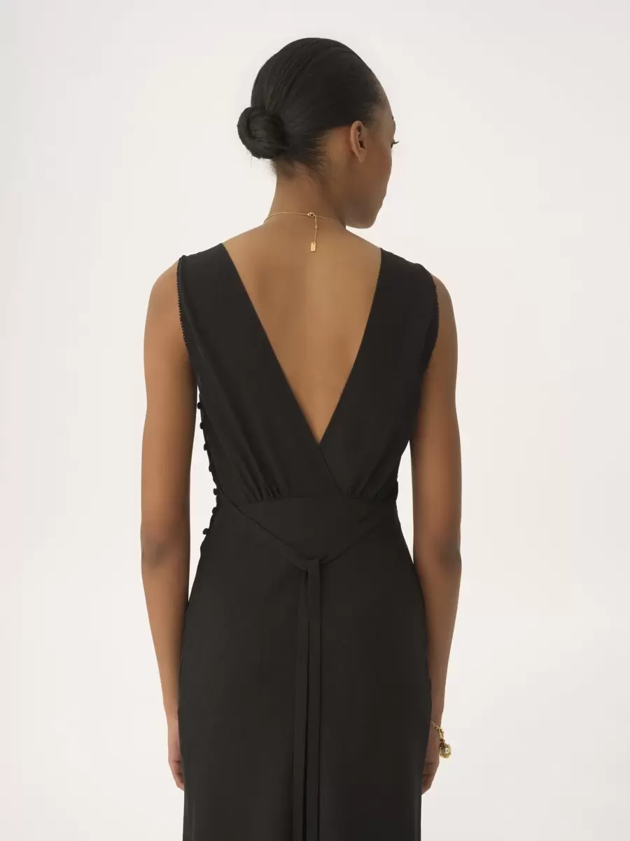 V-neck sleeveless column dress in mini floral jacquard organic silk with lace inserts, featuring fabric-covered buttons and a ribbon tie.