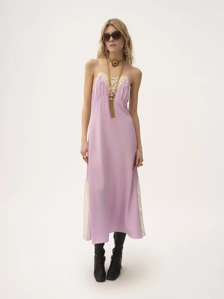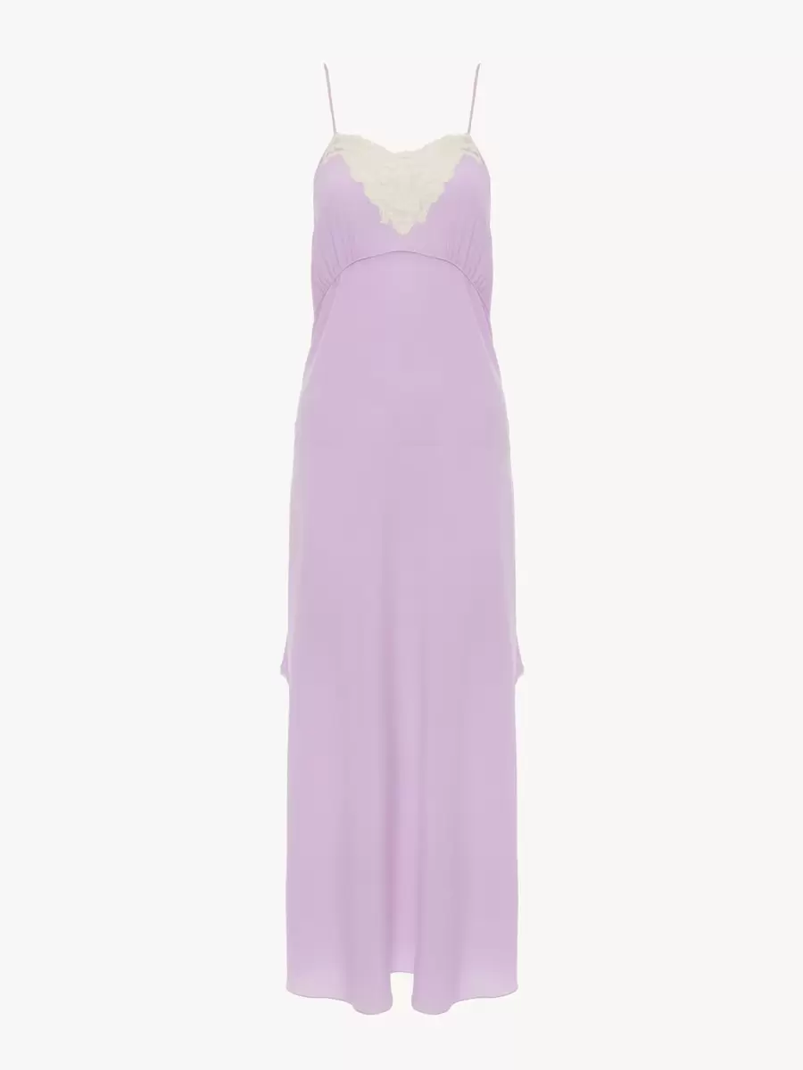 Thin-strap midi dress in organic silk crêpe de chine with contrast lace inserts and gathered details.