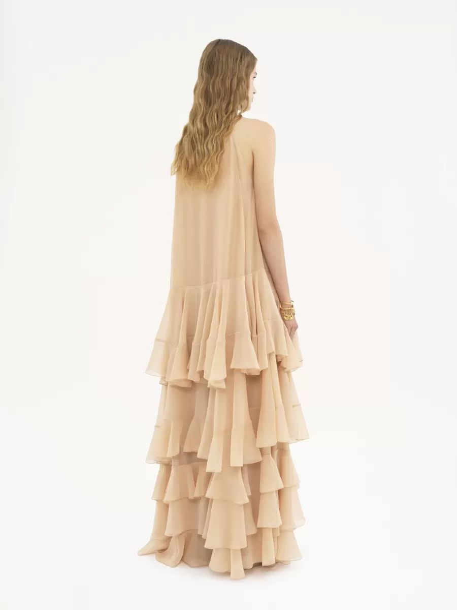 Sleeveless tiered maxi dress in semi-sheer organic silk georgette with a silk-mix lining, featuring a deep V-neck, cascading flounces and dangling ties finished with gold-toned tips.