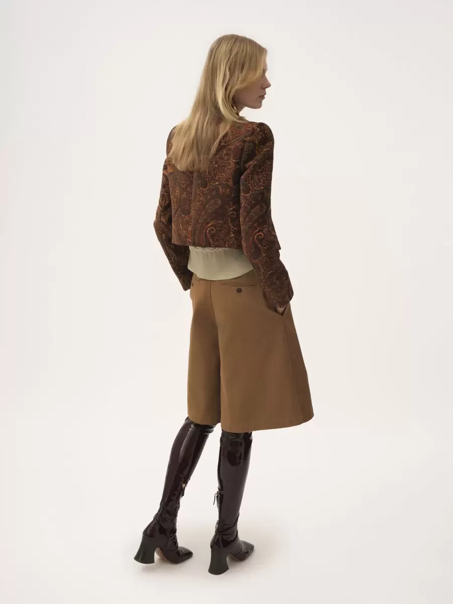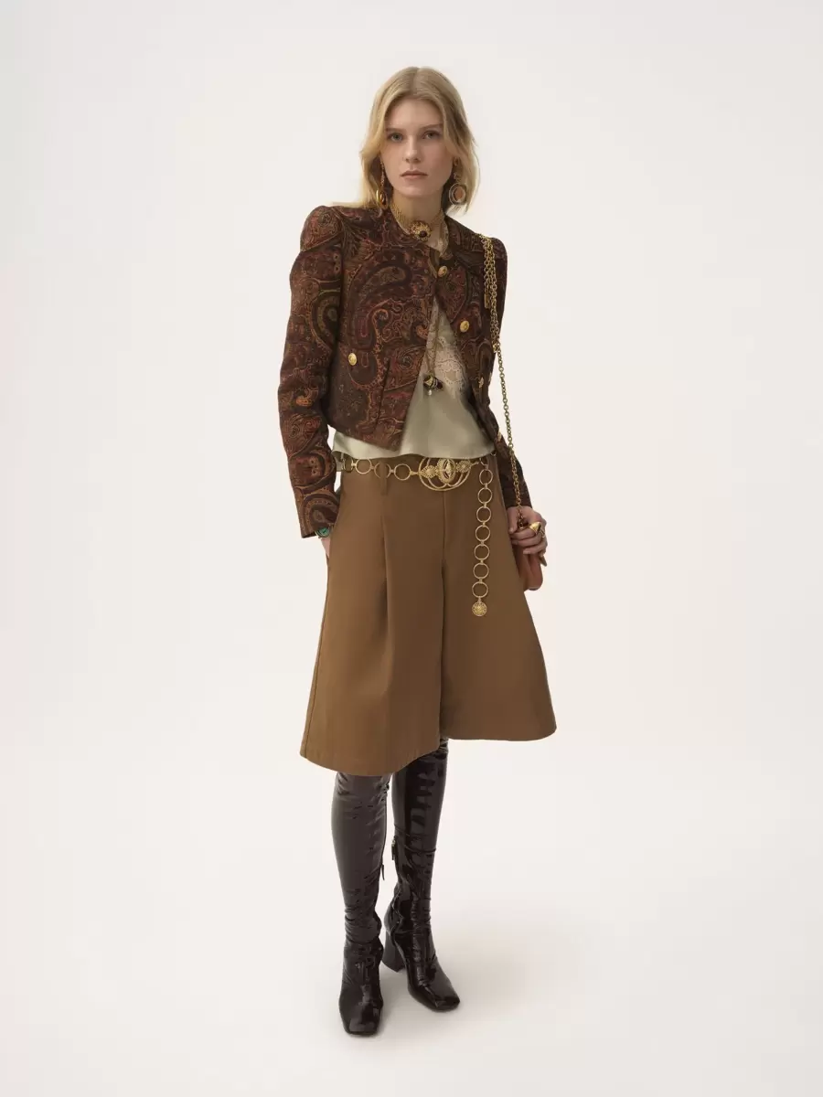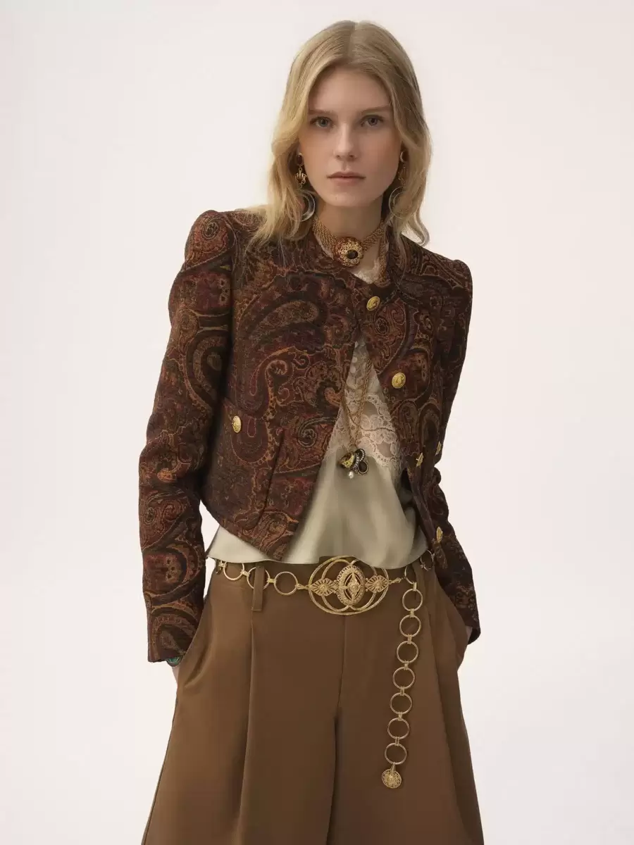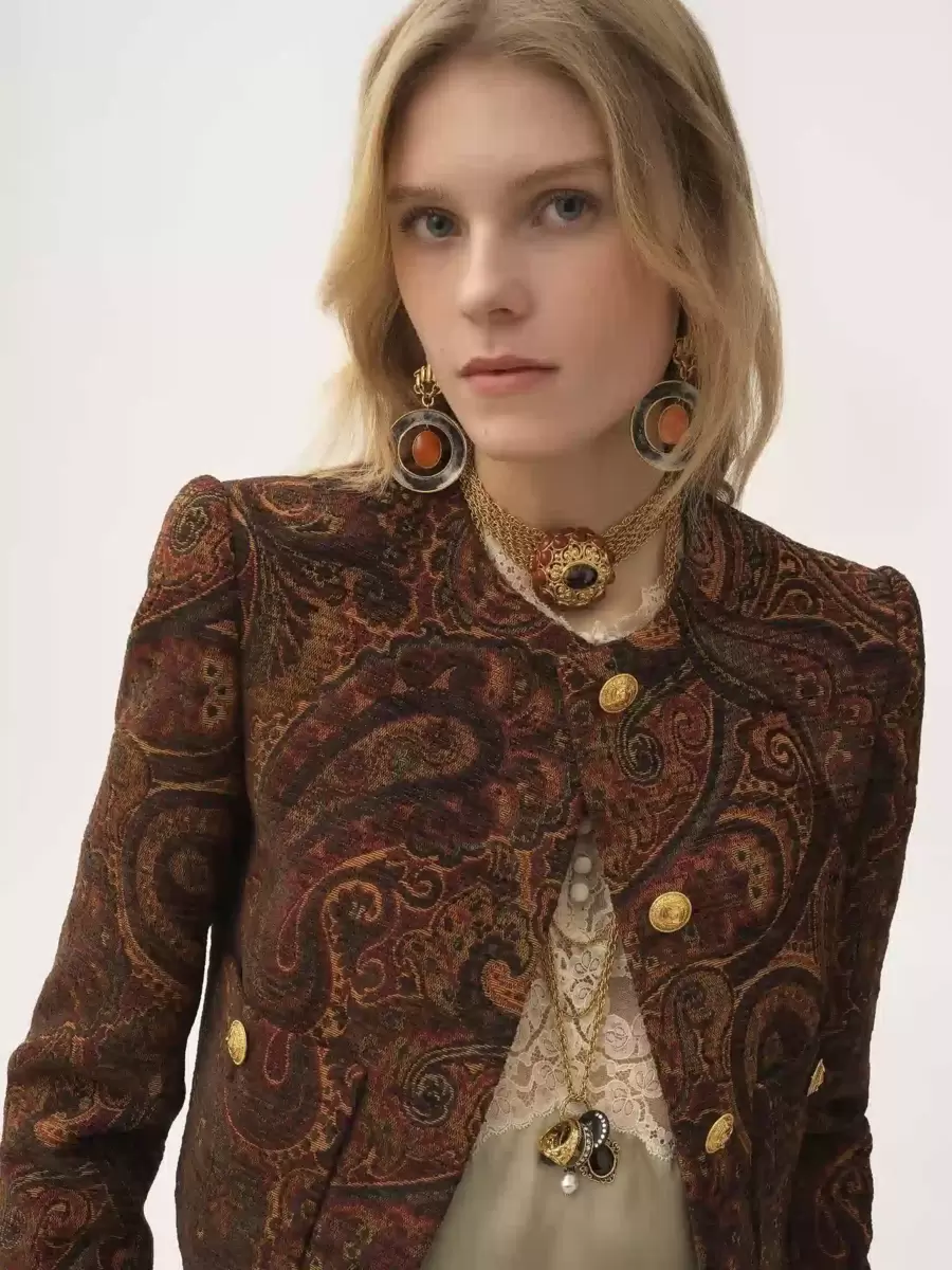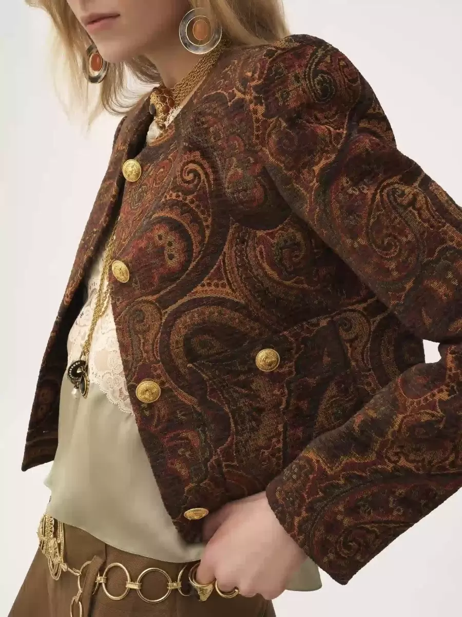 Boxy collarless jacket in paisley tapestry jacquard, featuring gold-tone buttons and front patch pockets.