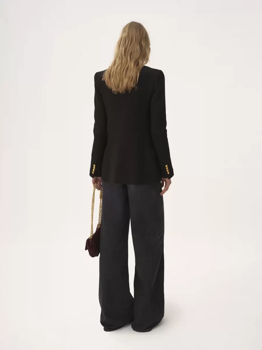 Double-breasted tailored jacket in wool bouclette, featuring gold-tone buttons and front flap pockets.