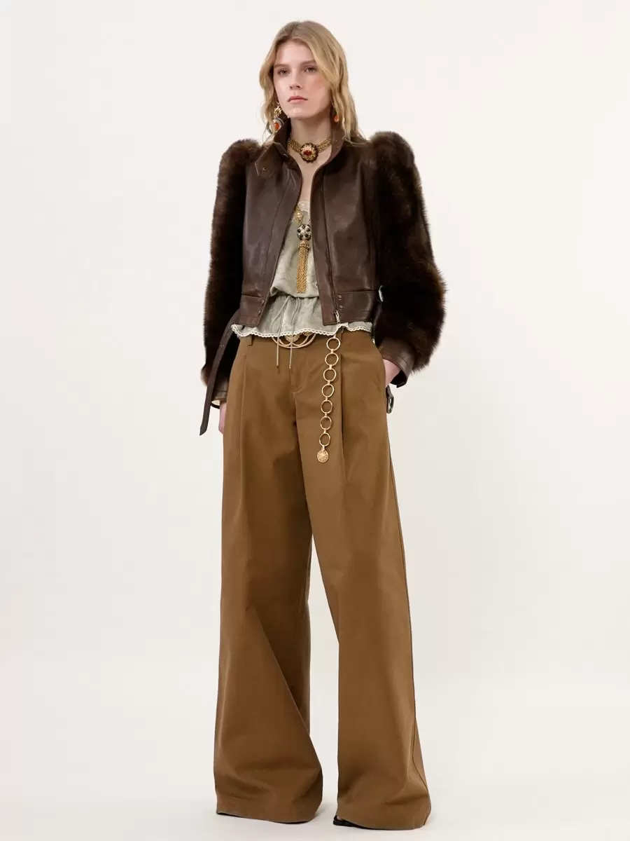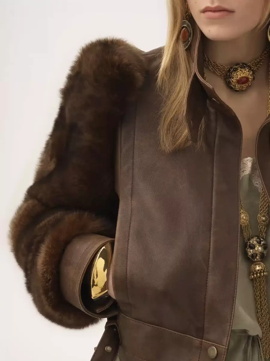 High-neck short jacket in vintage lambskin with shearling sleeves, featuring a buckled belt and Chloé-engraved, gold-brushed snap buttons.