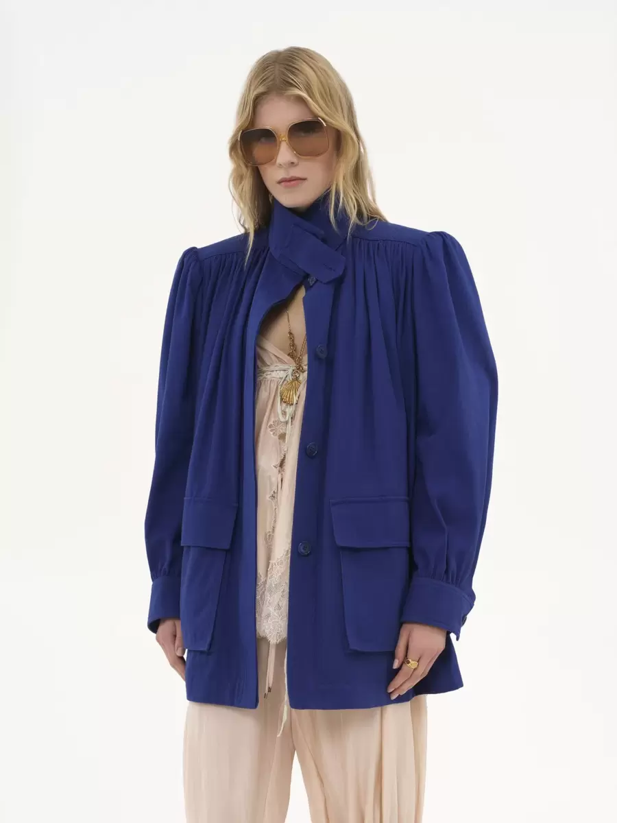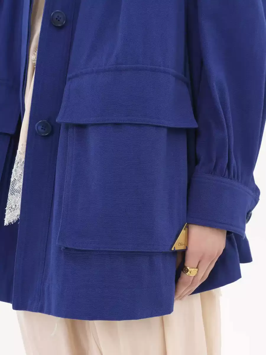 Gathered high-neck utilitarian jacket in cotton canvas, featuring puff sleeves, maxi flap pockets and engraved horn buttons. A gold-tone logo triangle signs the left pocket.