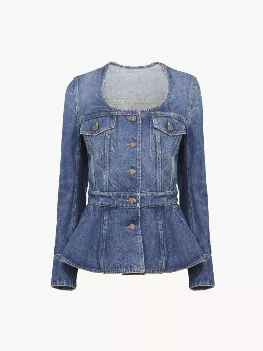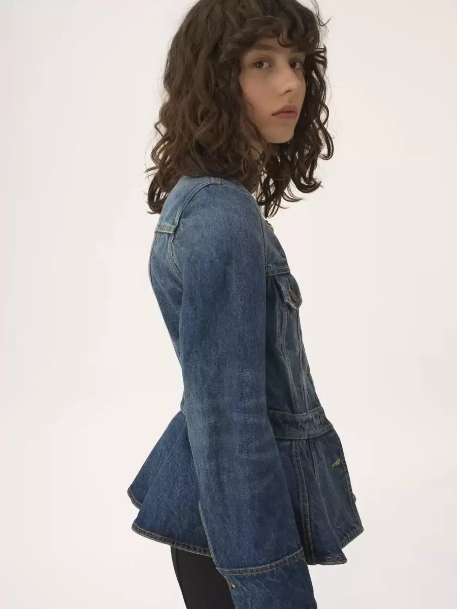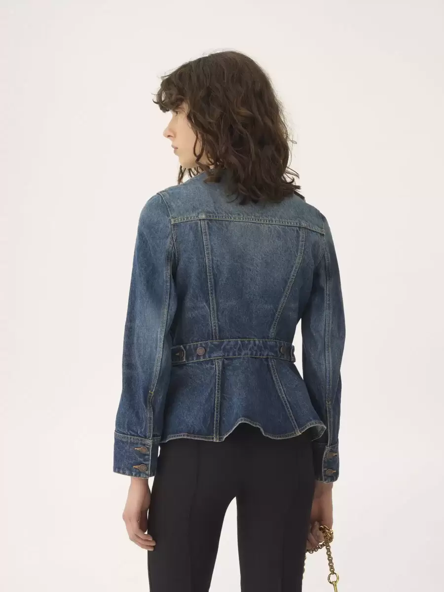 Scoop-neck peplum riding jacket in indigo wash organic cotton denim with Chloé-engraved buttons and flap chest pockets.