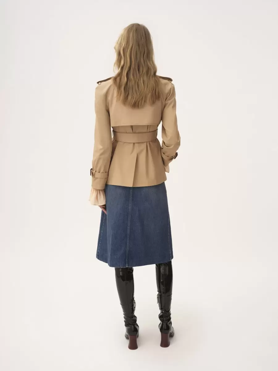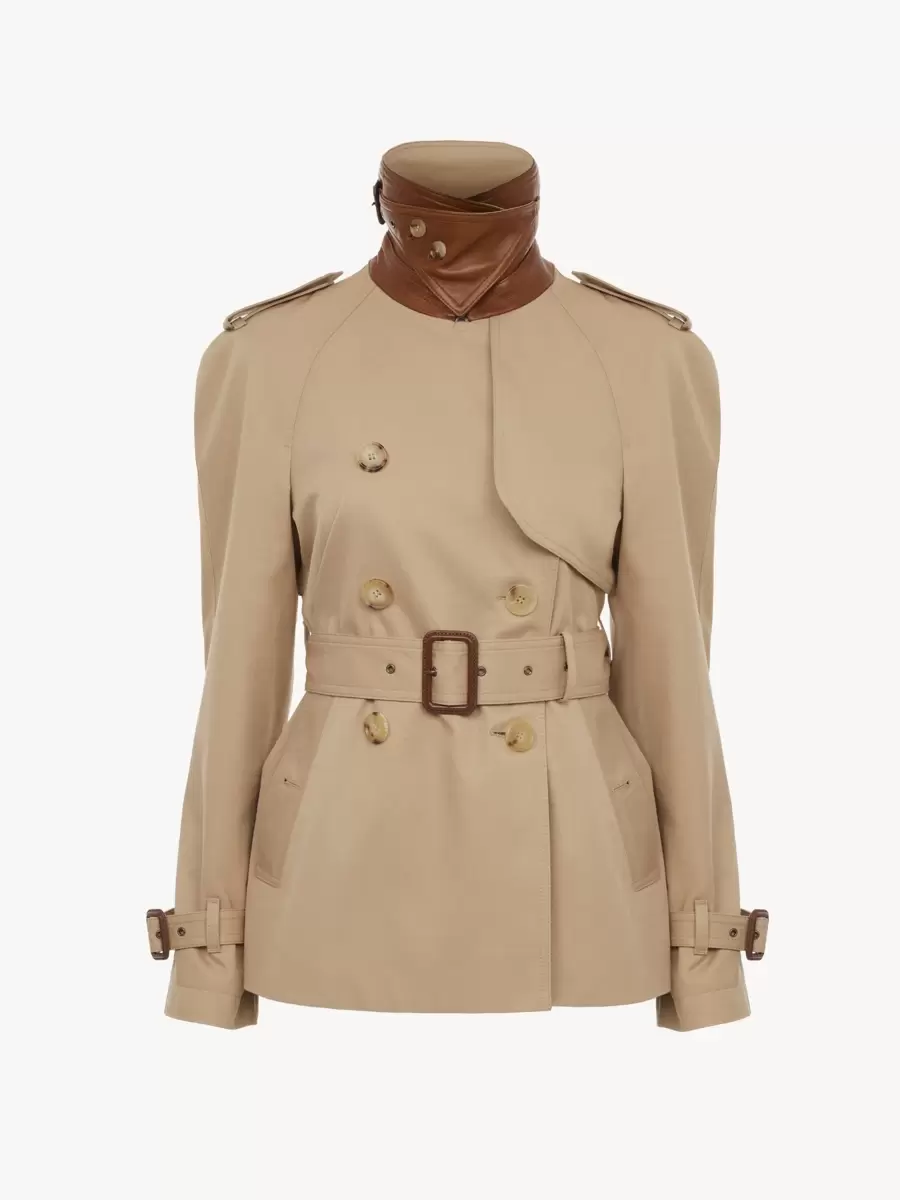 Short trench coat in cotton gabardine, featuring a lambskin-trimmed chin-strap collar, engraved horn buttons and a removable buckled belt. A storm flap, shoulder tabs and cuff tabs finish this piece.