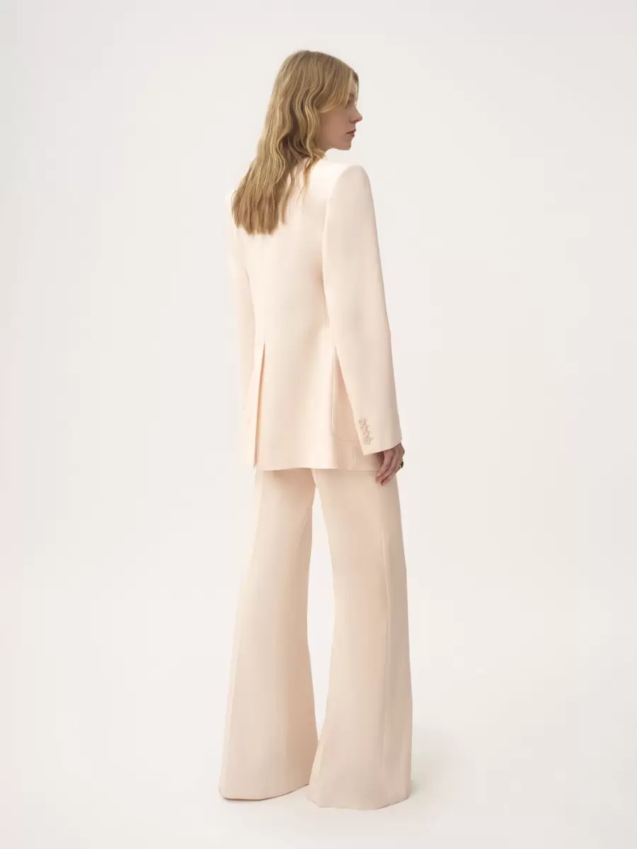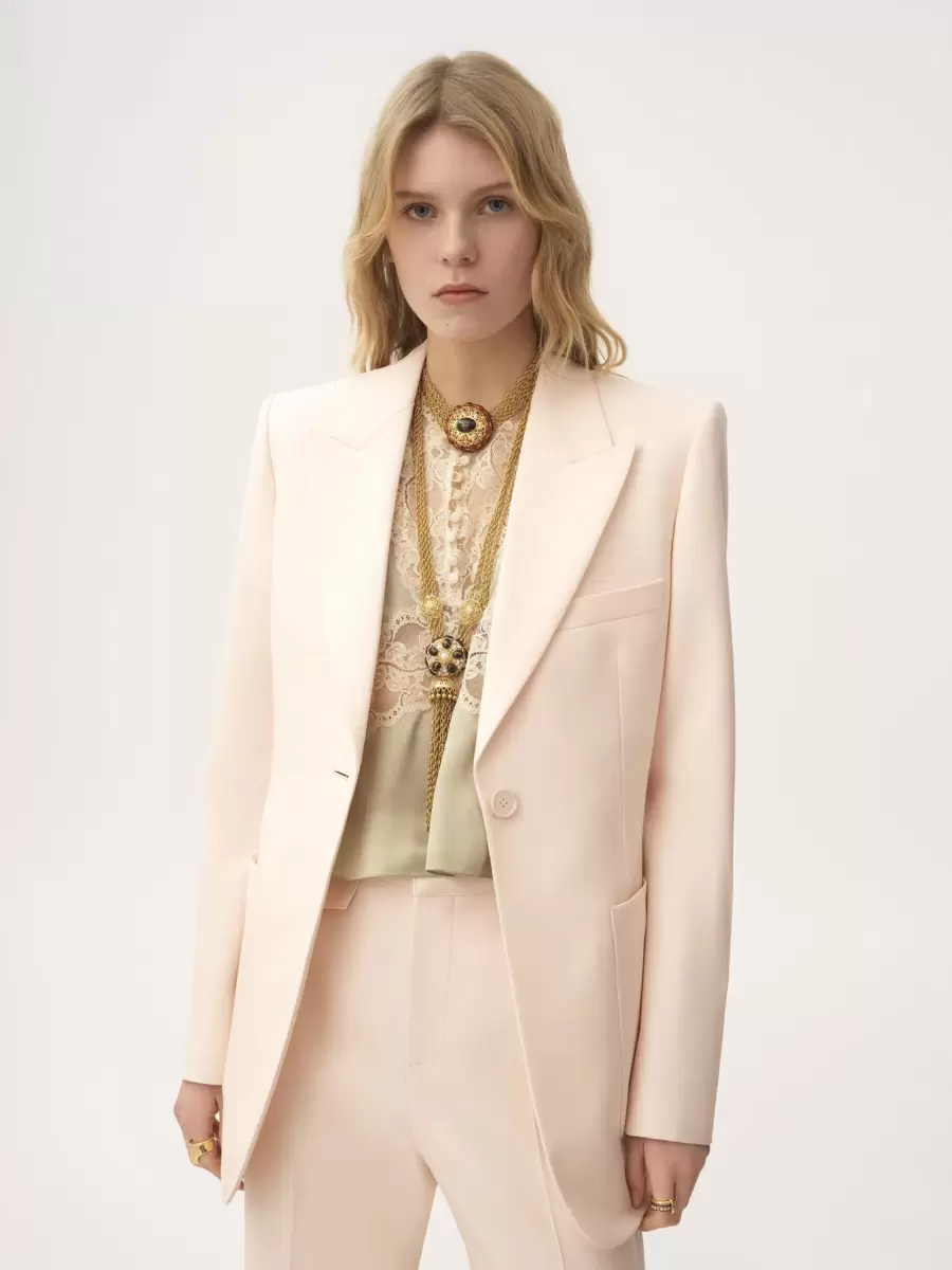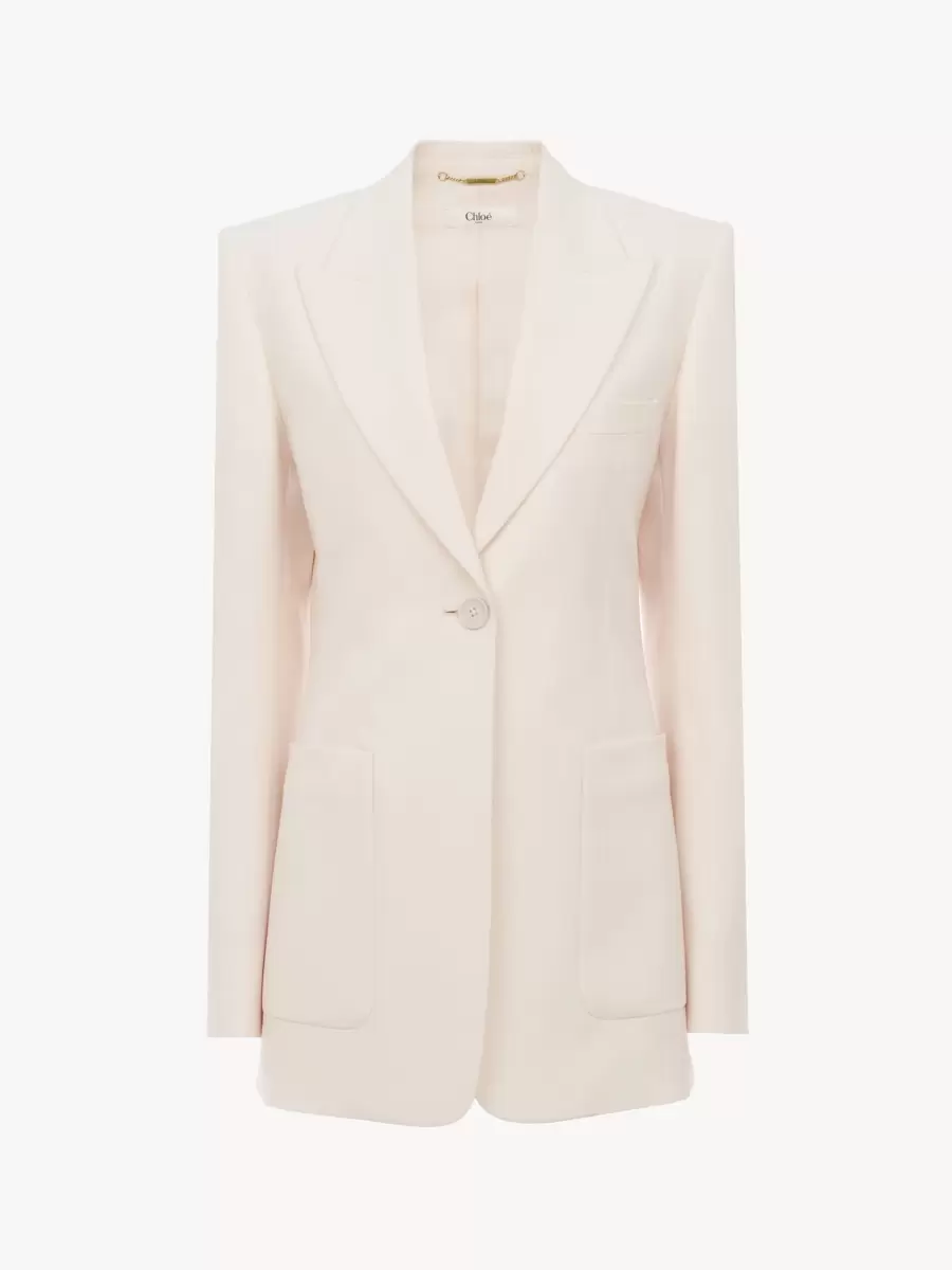 Single-breasted tailored jacket in lower-impact light wool gabardine, featuring oversized front patch pockets and engraved tonal horn buttons.