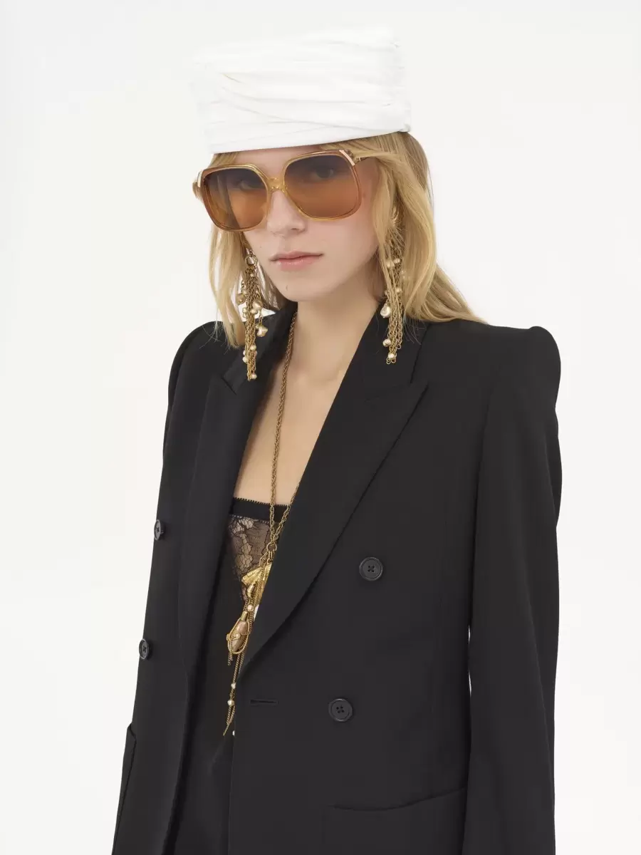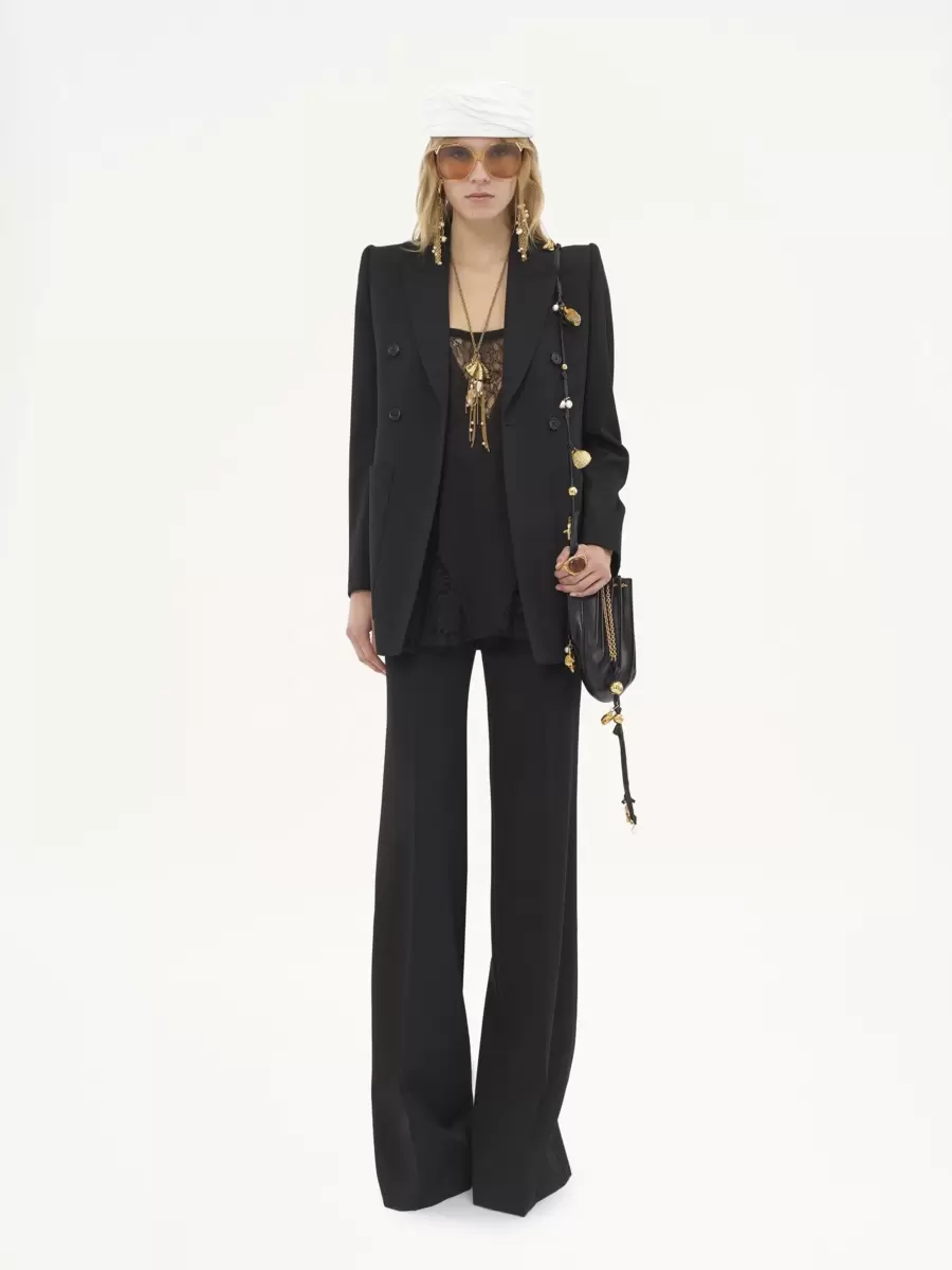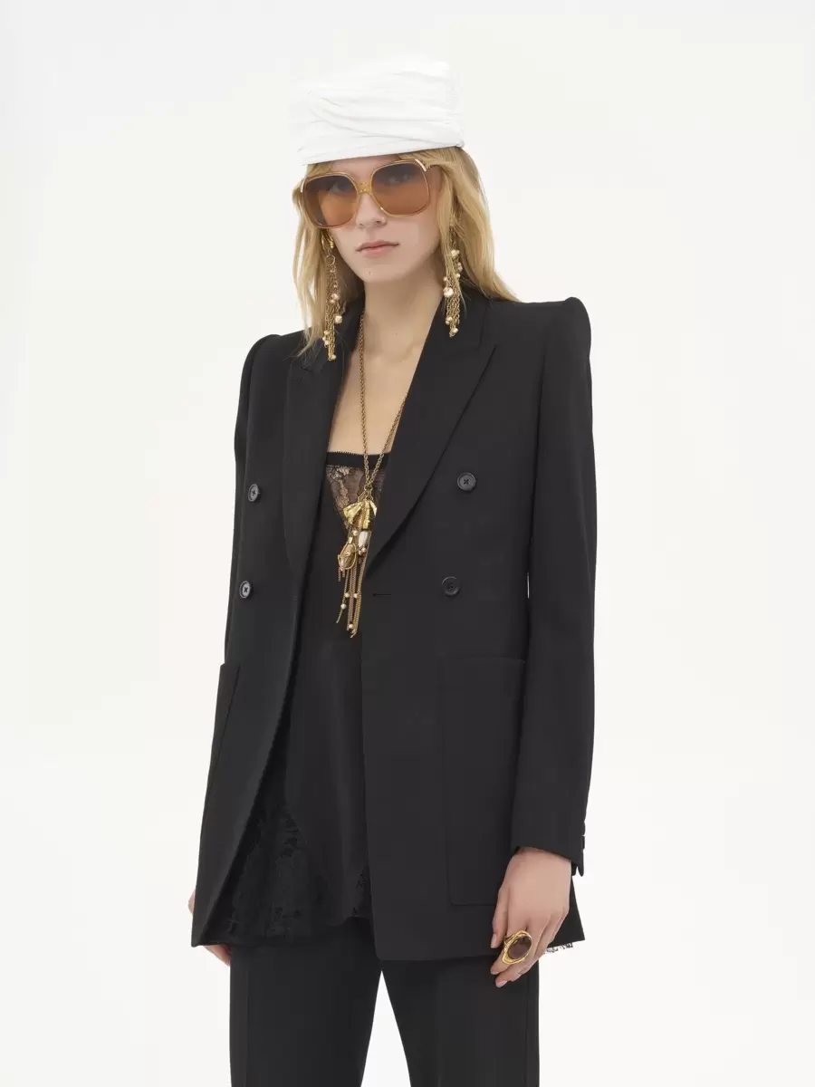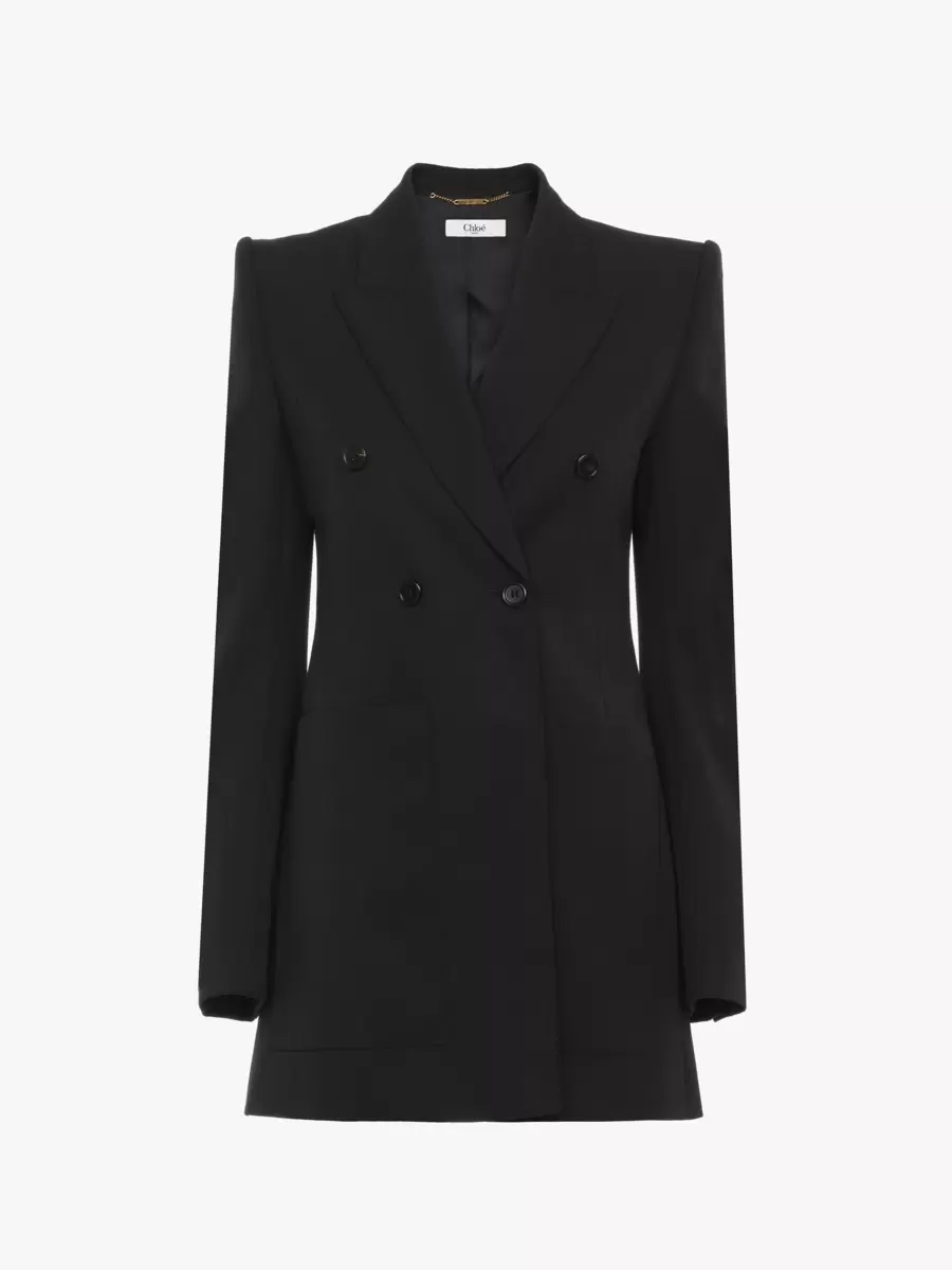 Double-breasted tailored jacket in lower-impact wool grain de poudre, with engraved horn buttons and maxi patch pockets.