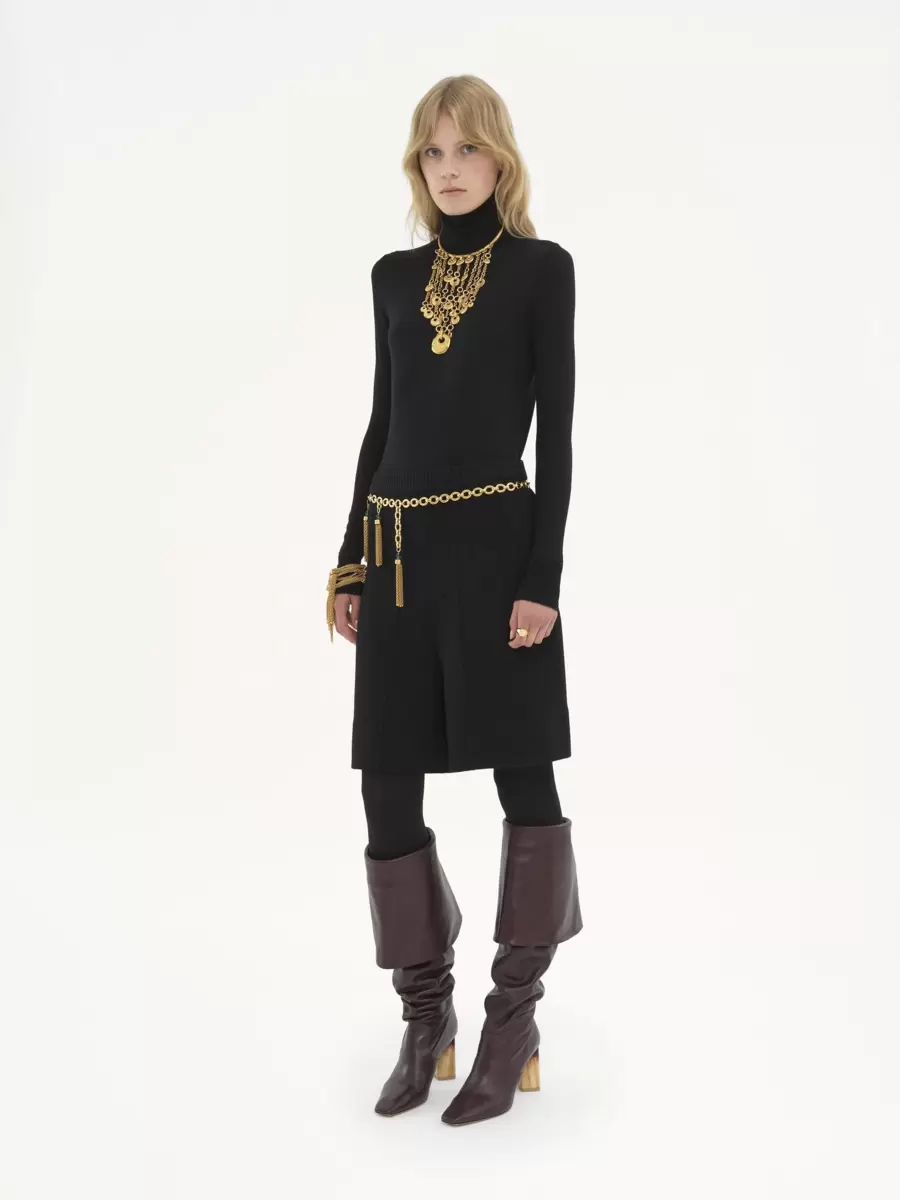 Fitted turtleneck top in a lower-impact wool ribbed knit, featuring embellished cuffs.