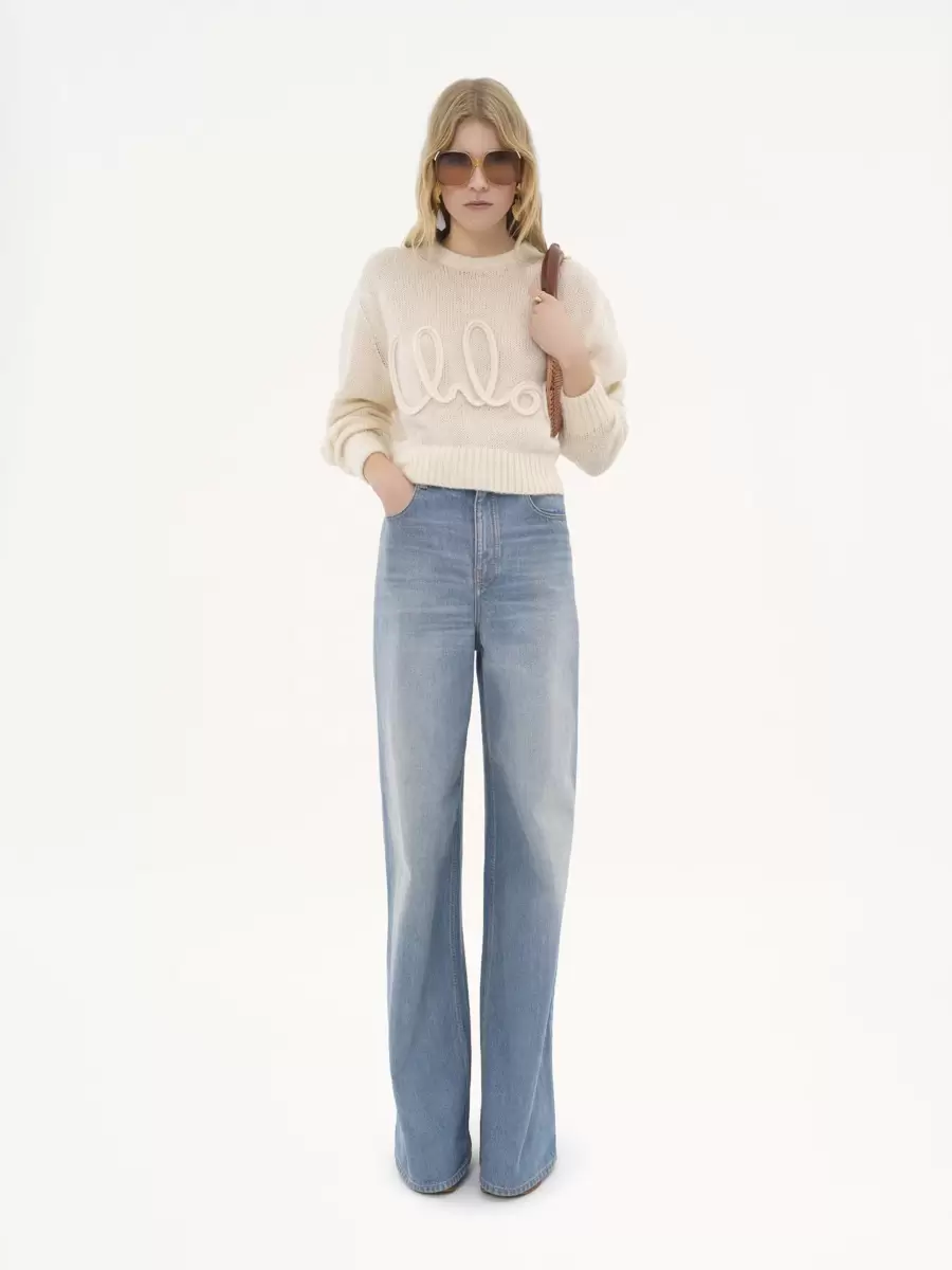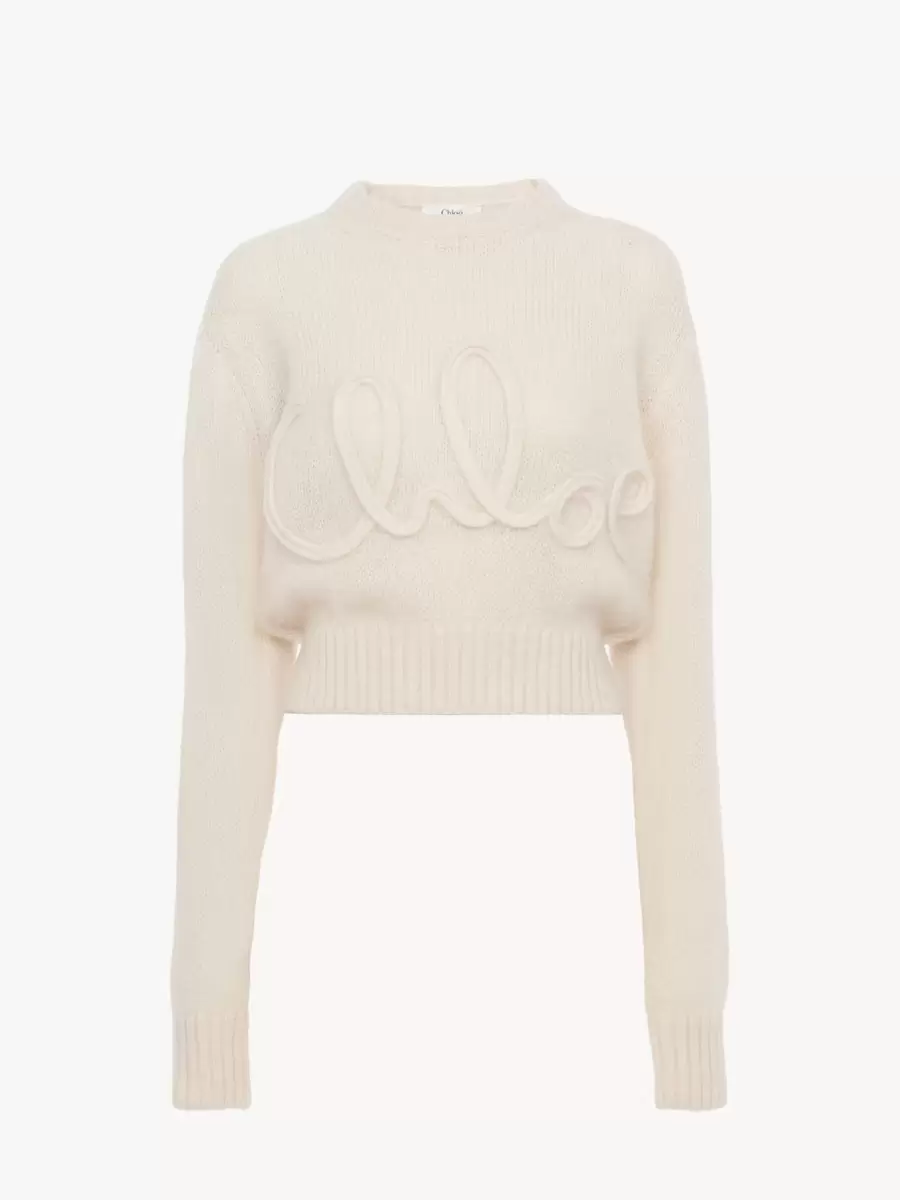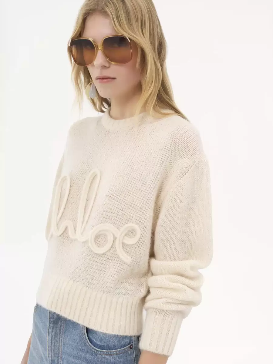 Crew-neck sweater in an alpaca wool and silk knit, detailed with ribbed trims and large Chloé embroidery at the front.