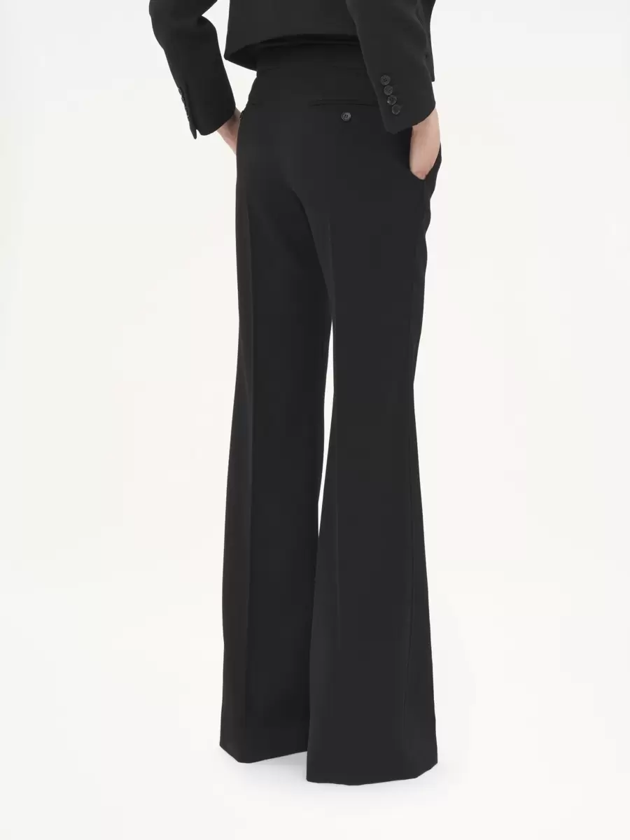 Regular-waisted flared tailored pants in lower-impact wool gabardine, finished with pressed front creases and a gold-tone D-ring at the right hip.