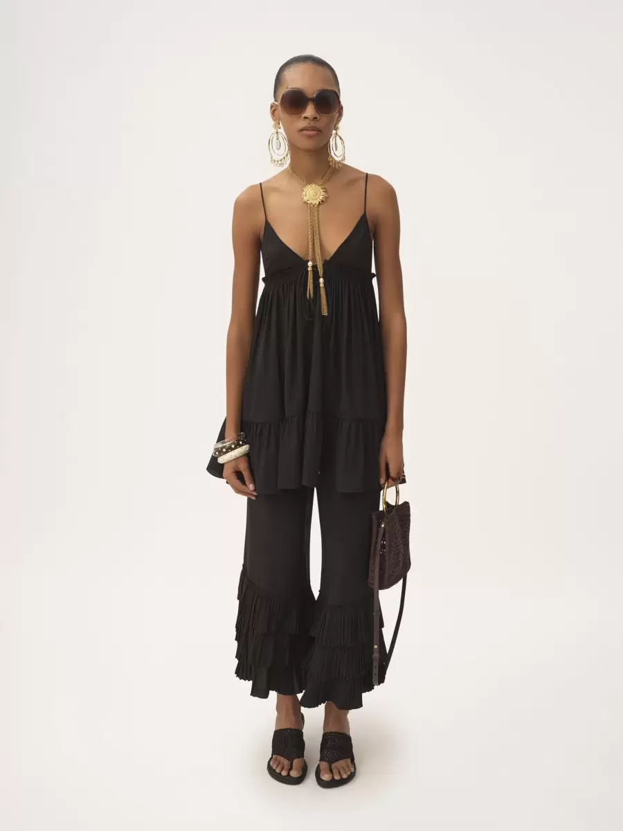Fluid wide-leg pants in organic silk crêpe de chine with a tiered, ruffled hem.