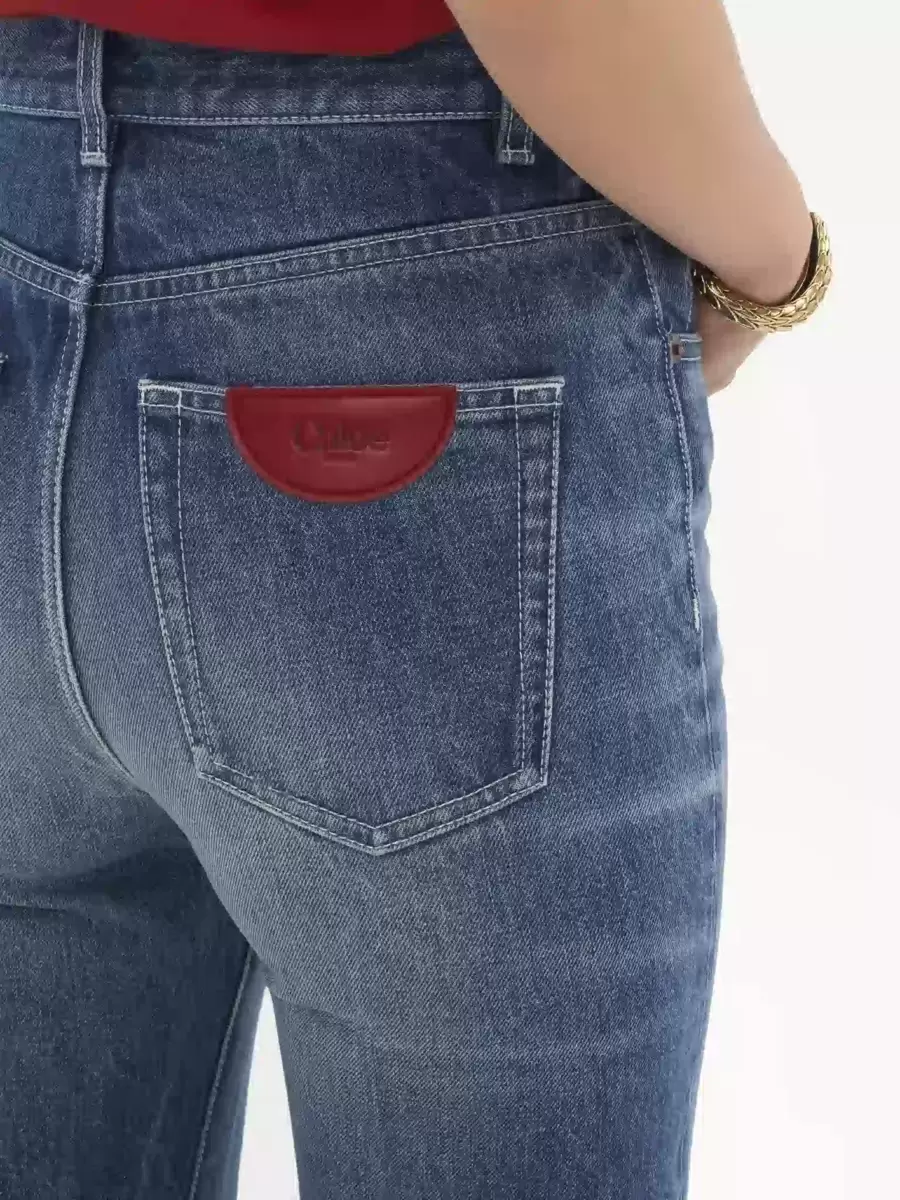 High-rise bootcut jeans in waterless denim with a raw hem, featuring a gold-toned metal snake embellishment around one of the belt loops.