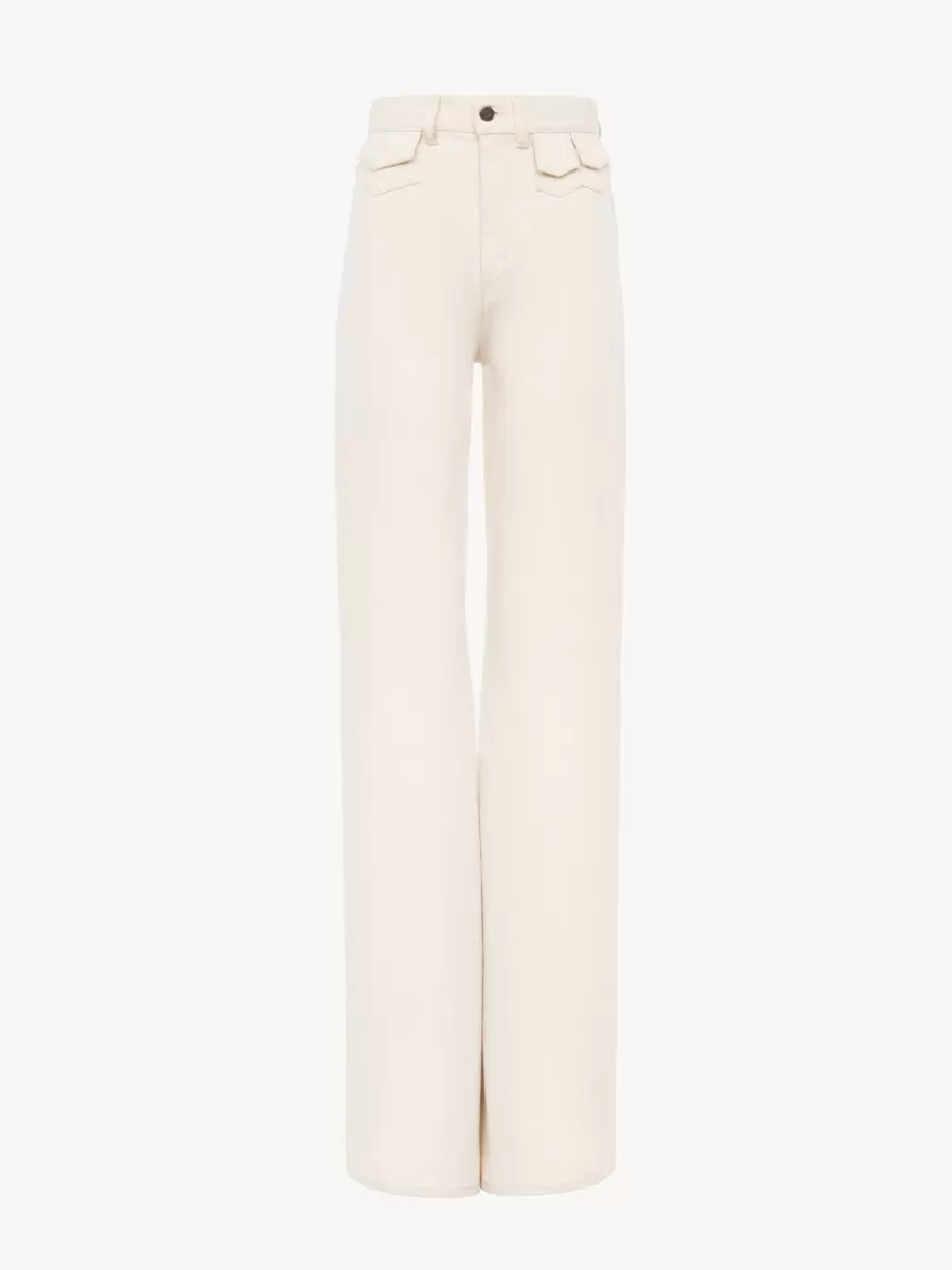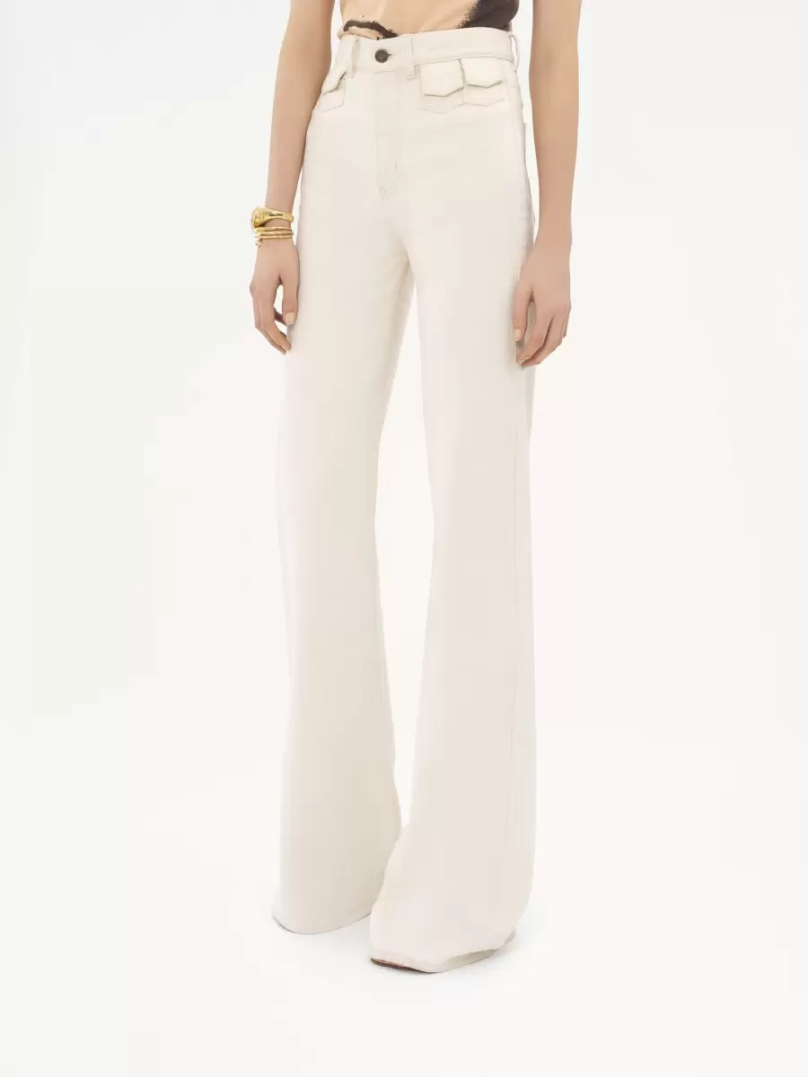 High-rise flare jeans in organic cotton denim with mini flap pockets at the waist.