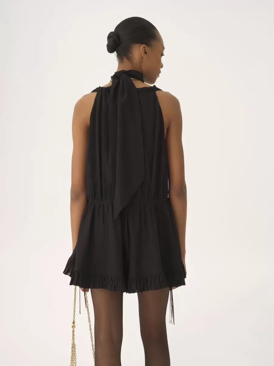 Deep V-neck ruffled jumpsuit in organic silk georgette with a scarf tied at the back. Ruffle trims detail the hem, while the drawstring waist features dangling ties finished with gold-tone metal tips.