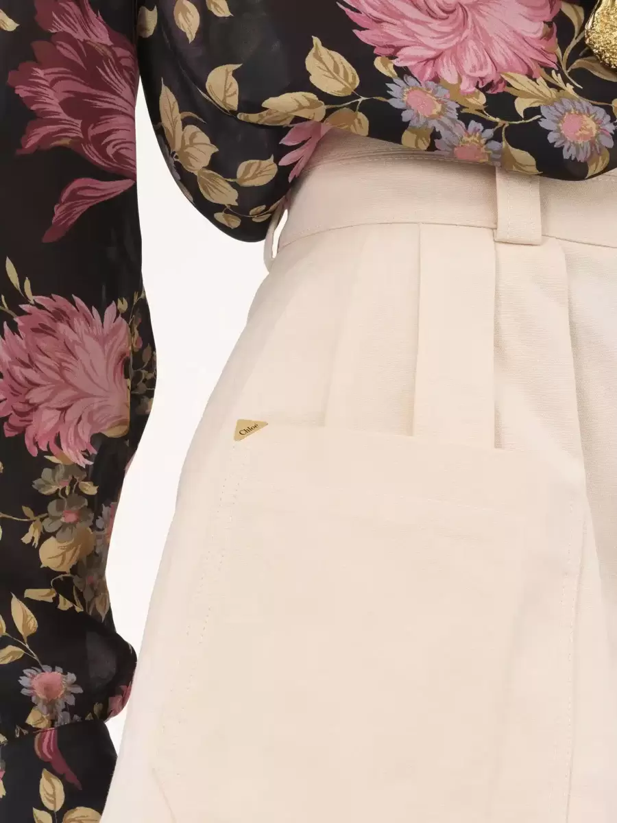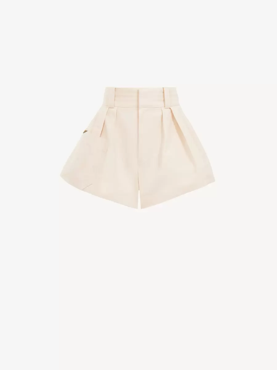 High-rise mini shorts in garment-dyed organic cotton canvas with pleats and an asymmetrical front patch pocket detailed with a gold metal Chloé logo triangle.