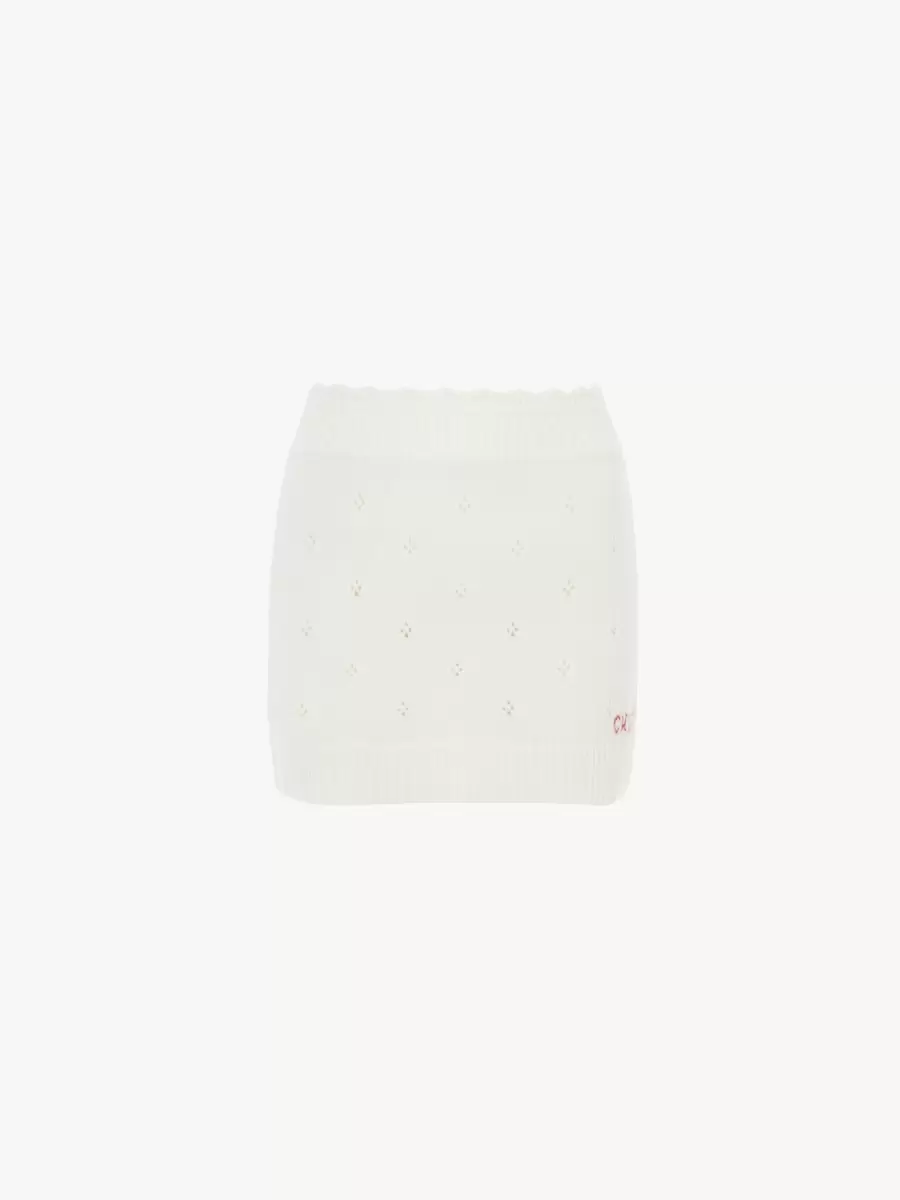 Fitted mini skirt in a lower-impact chunky wool and cashmere knit with an openwork motif, featuring a scalloped waist, ribbed trims and Chloé logo embroidery at the hem.