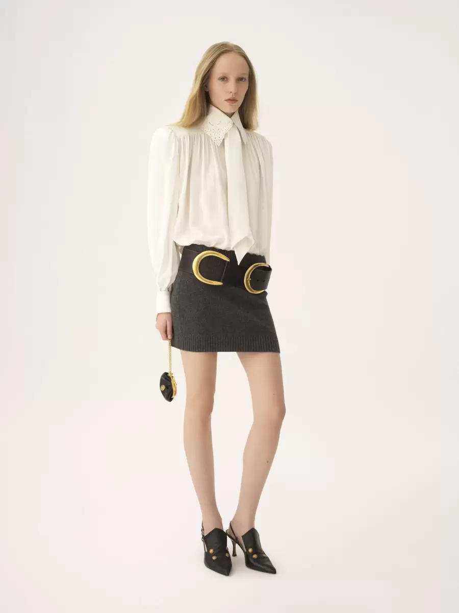Fitted mini skirt in a lower-impact wool and cashmere knit, featuring a scalloped waist and ribbed trims.