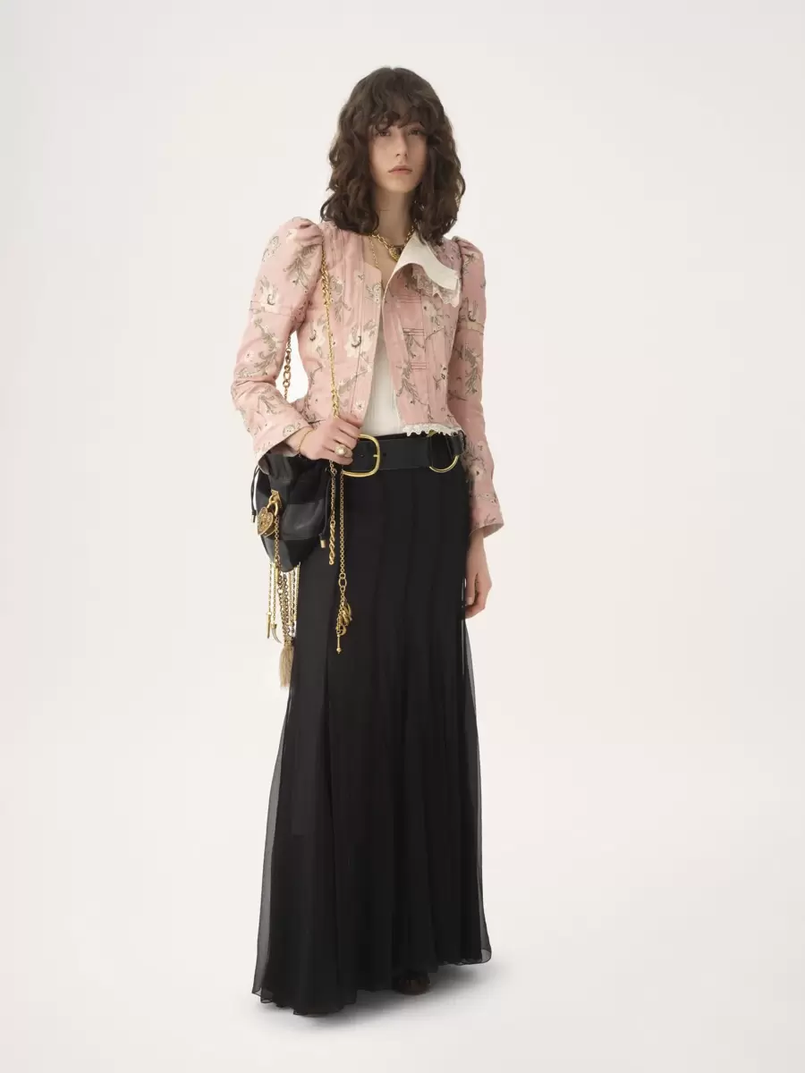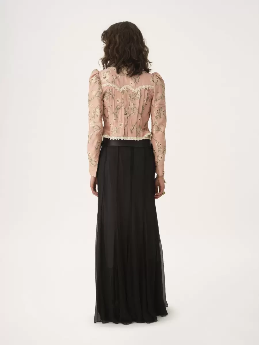 Gathered fluid maxi skirt in organic silk mousseline with a silk-mix lining, detailed with flounces.