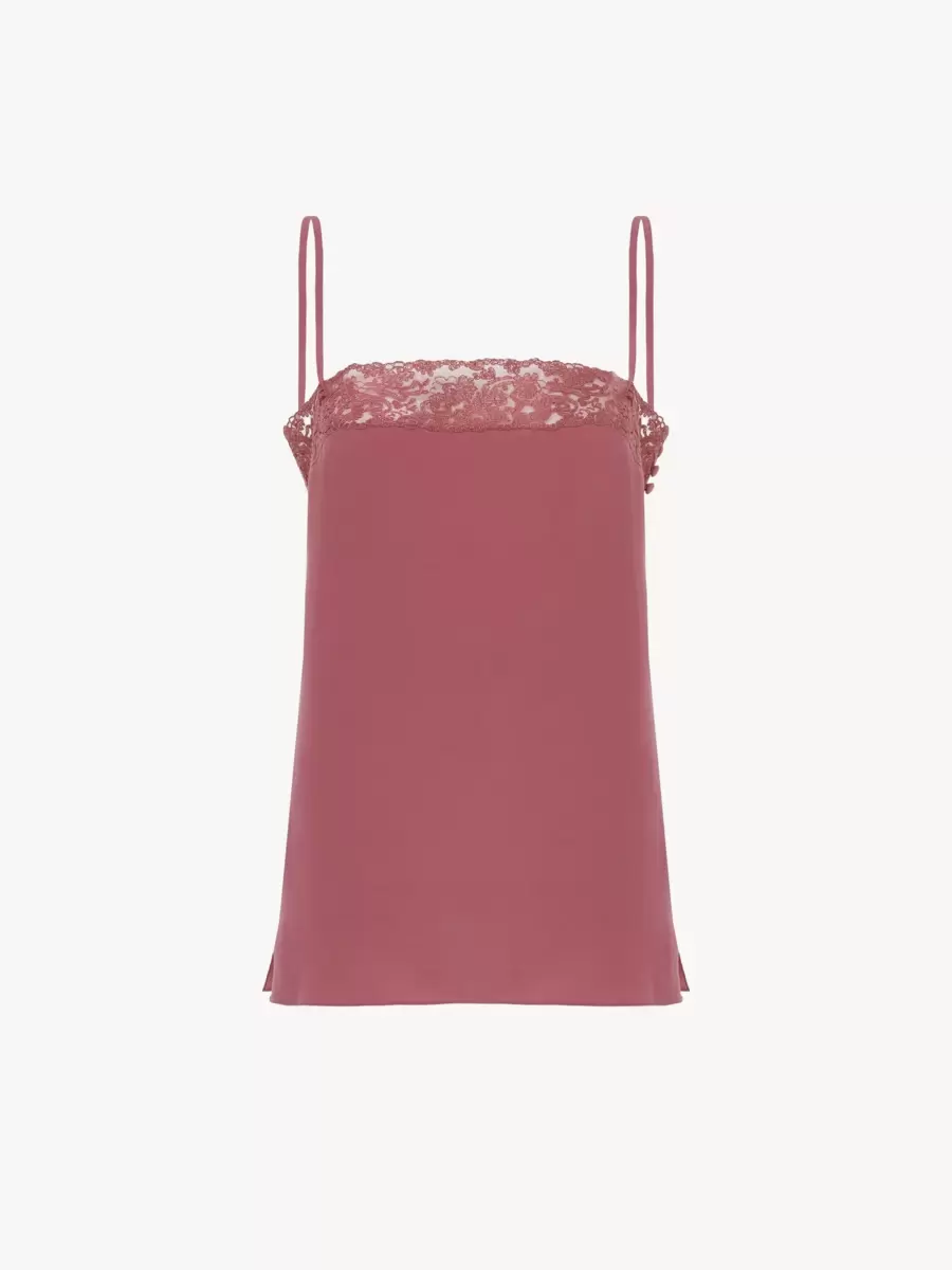 Fluid camisole top in organic silk crêpe de chine, featuring thin straps and lace inserts along the neckline.