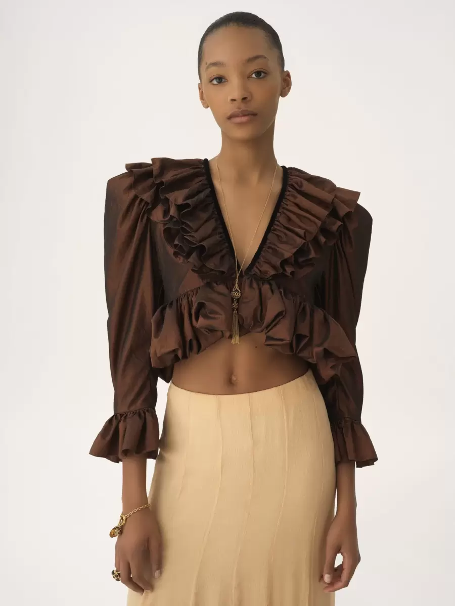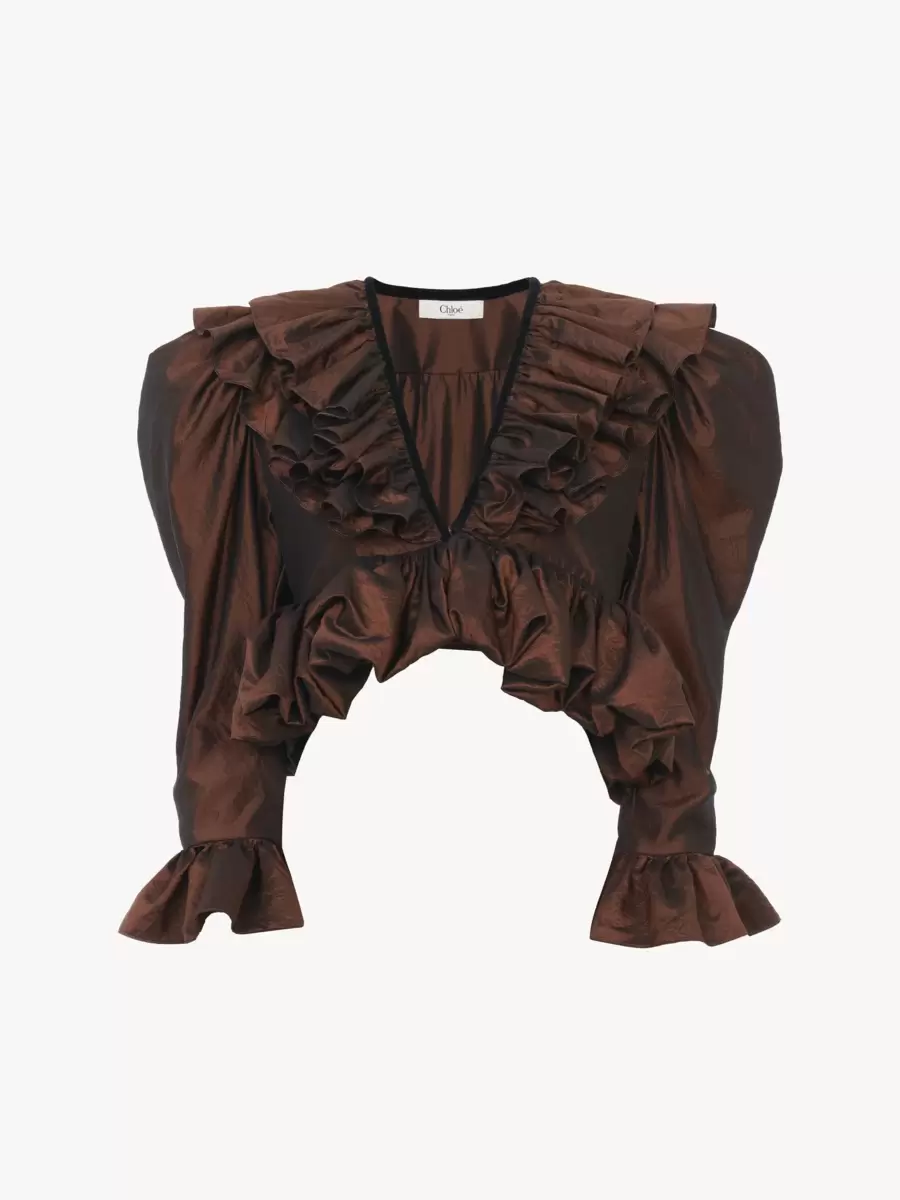 Cropped V-neck ruffle top in washed radiant silk taffeta, featuring puff sleeves and a front tie fastening.