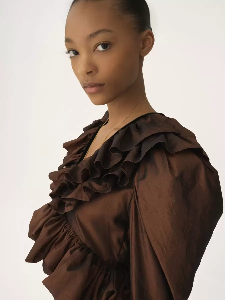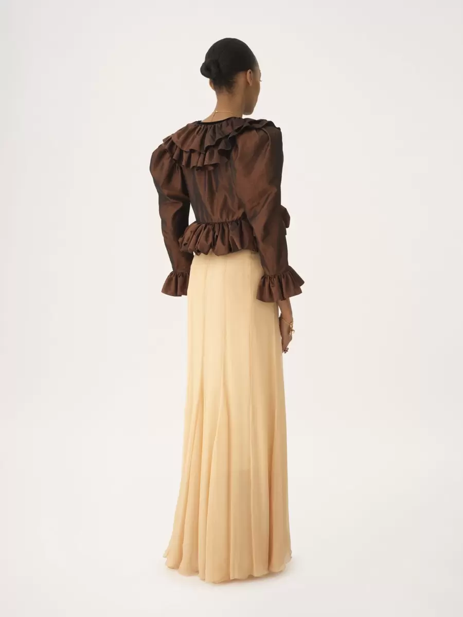 This product was made by Marie Helene Couture, a long-standing partner of Chloé based in Morlaas, France. Marie Helene Couture excels in the specialized technique of couture “flou”. Their expertise aligns with the rigorous standards set by the “métiers de la mode, vêtement flou” certification, ensuring a high level of professional aptitude in this delicate and skilled art form.