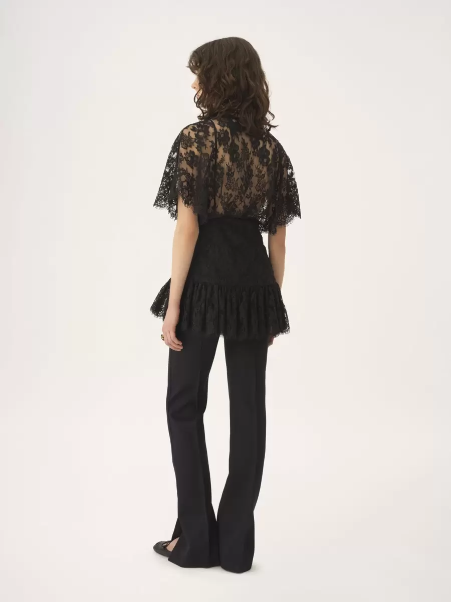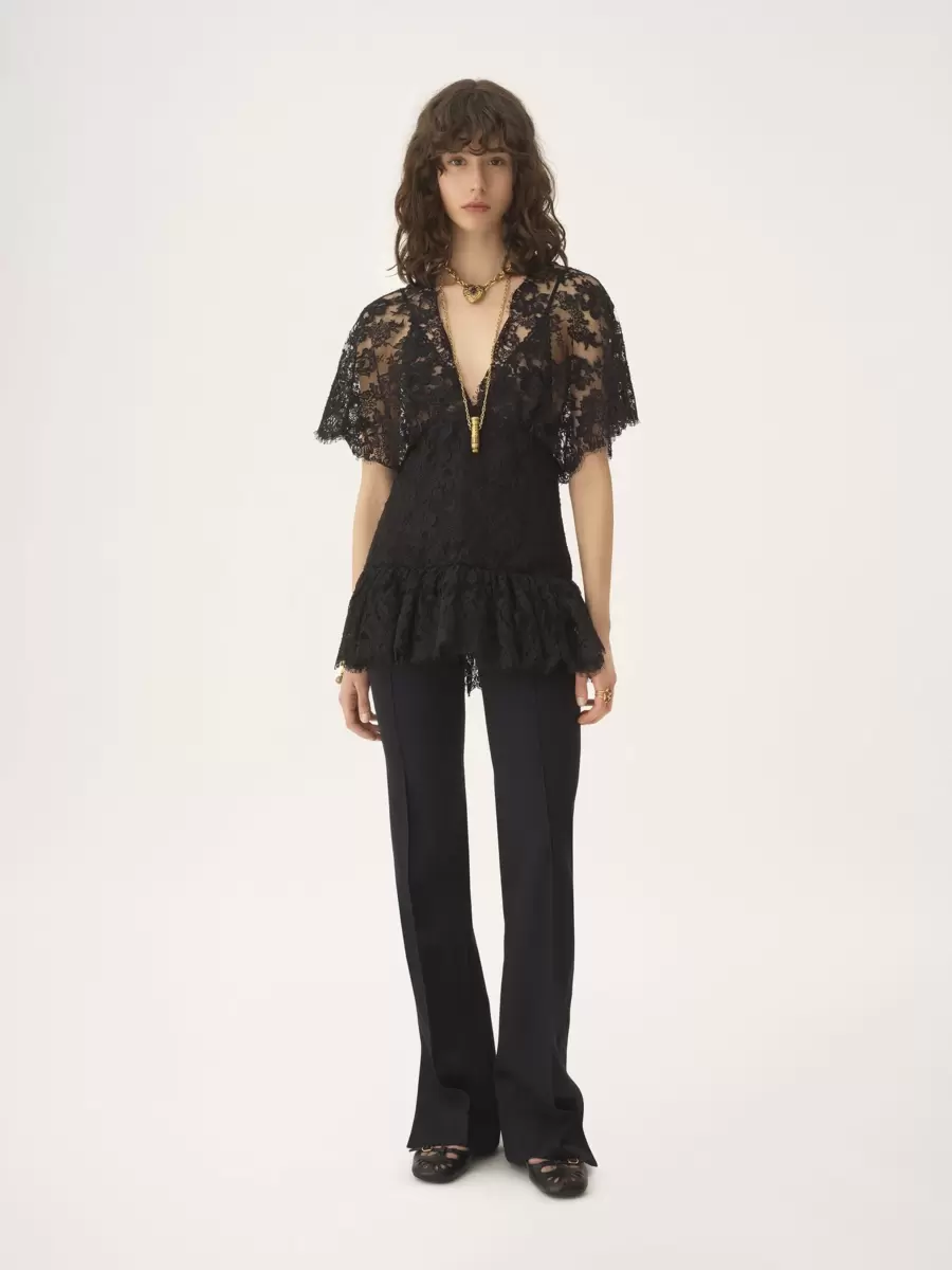 V-neck fitted ruffle top in floral lace with a silk-mix lining, featuring a flouncy hem.