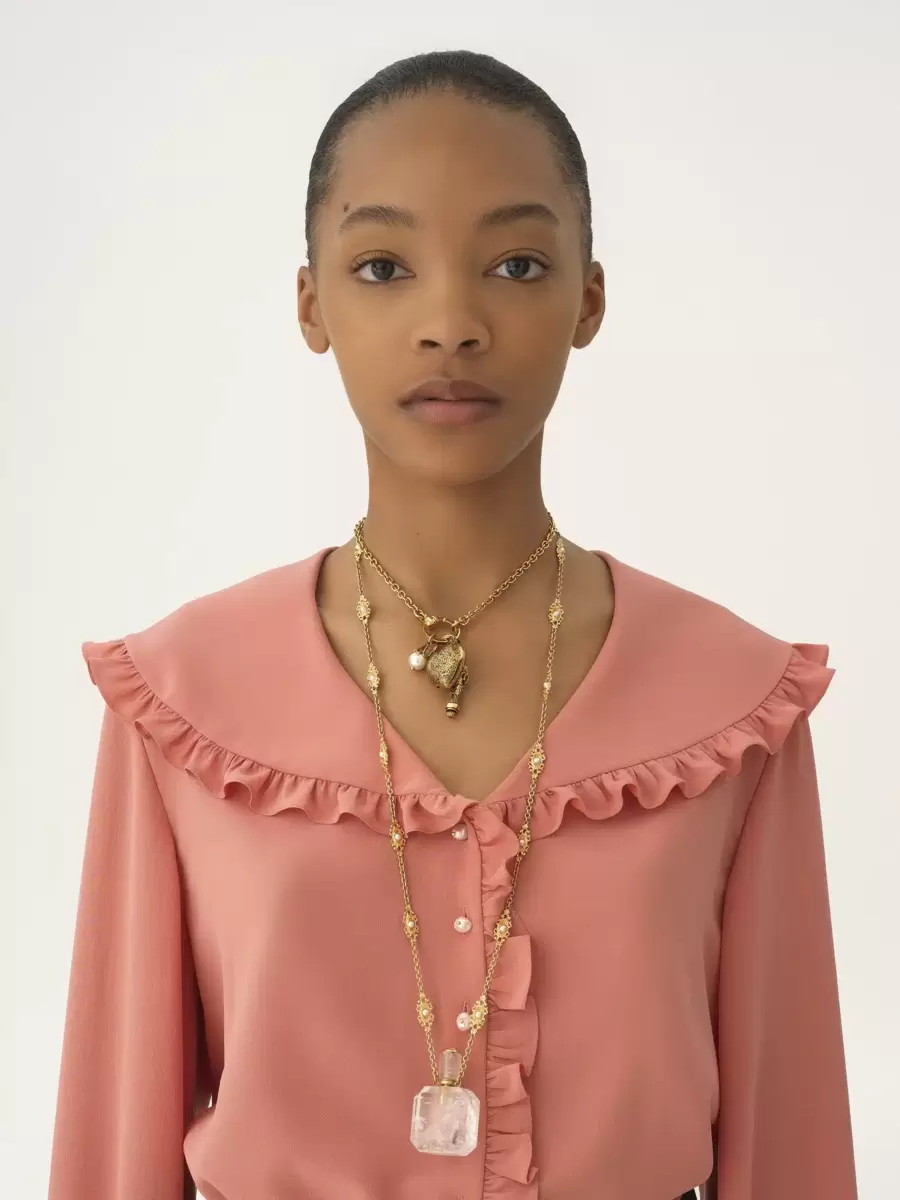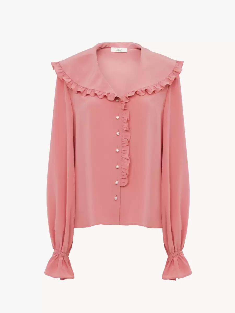 Wide-collar fluid blouse in organic silk light crêpe de chine, featuring ruffle trims, white pearl buttons and elasticated cuffs.