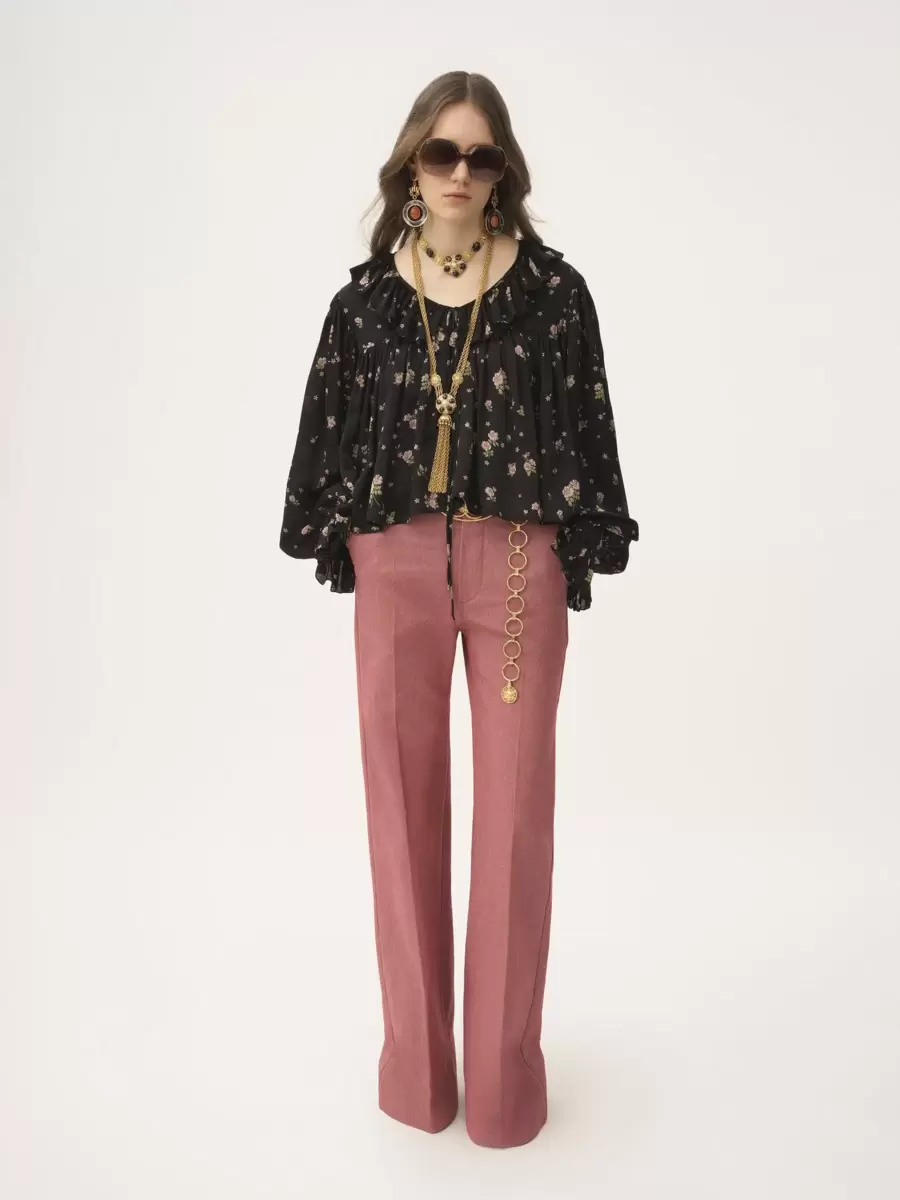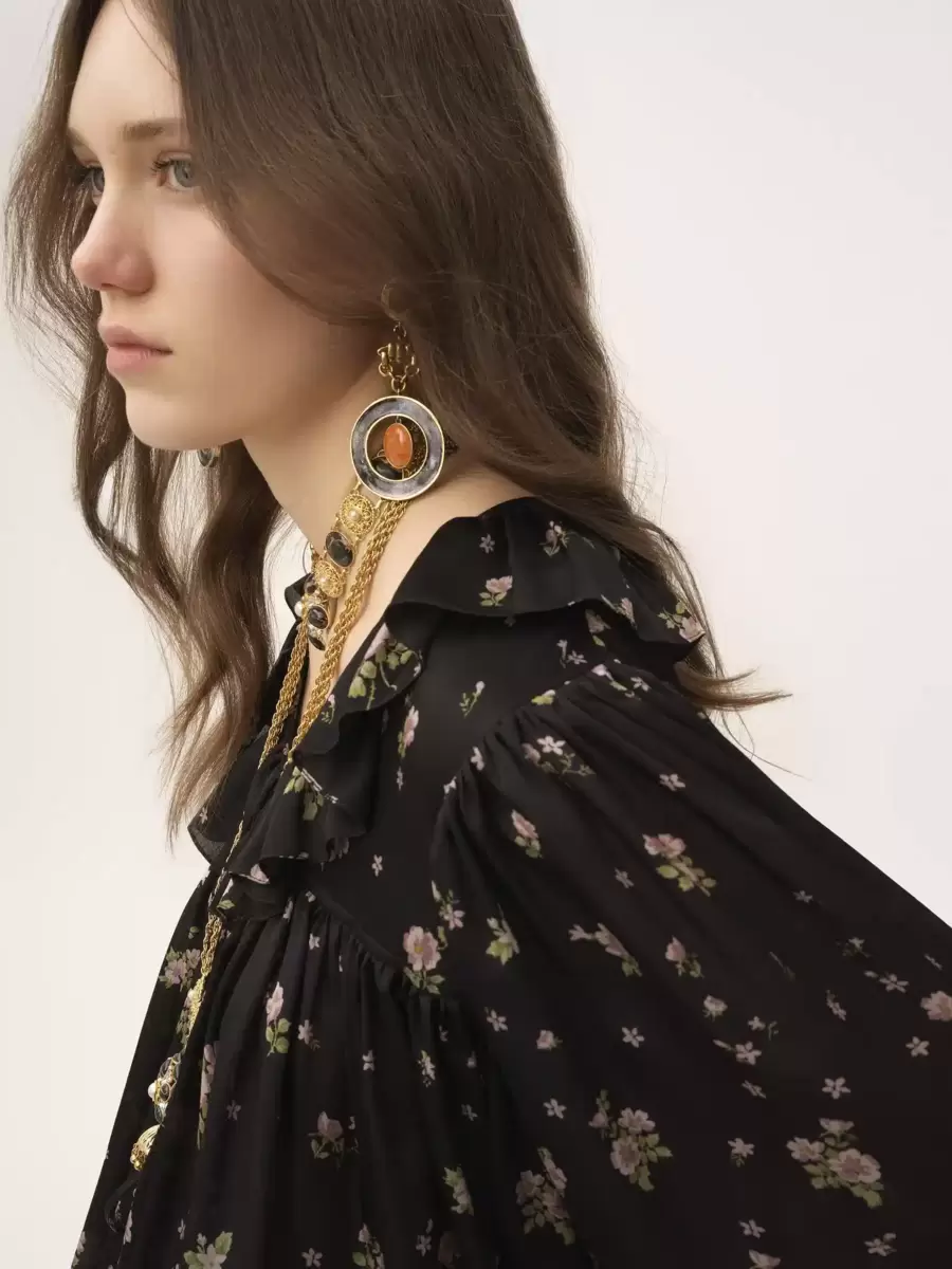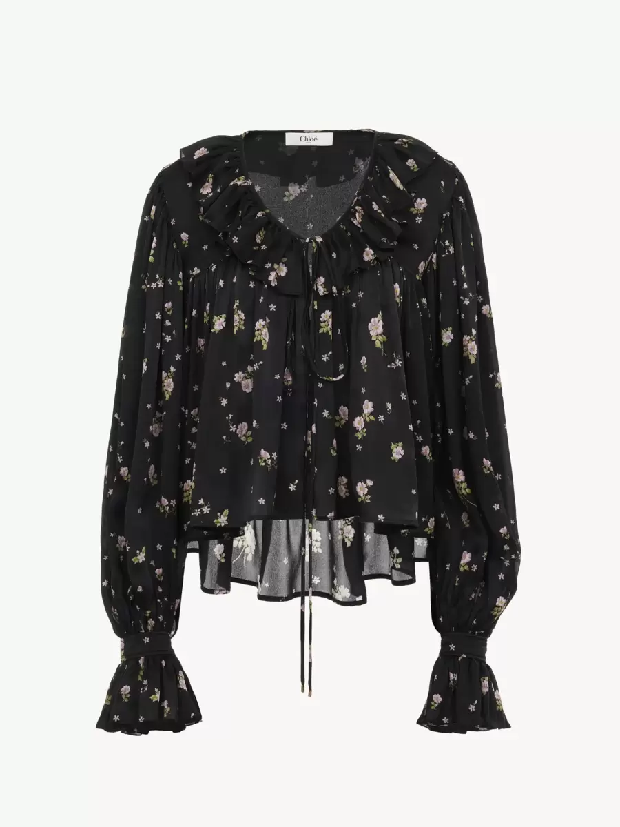 V-neck maxi gathered ruffle top in silk charmeuse with a Liberty print and a silk-mix lining, featuring a flouncy neckline, gathered details and dangling ties with gold-tone metal tips.