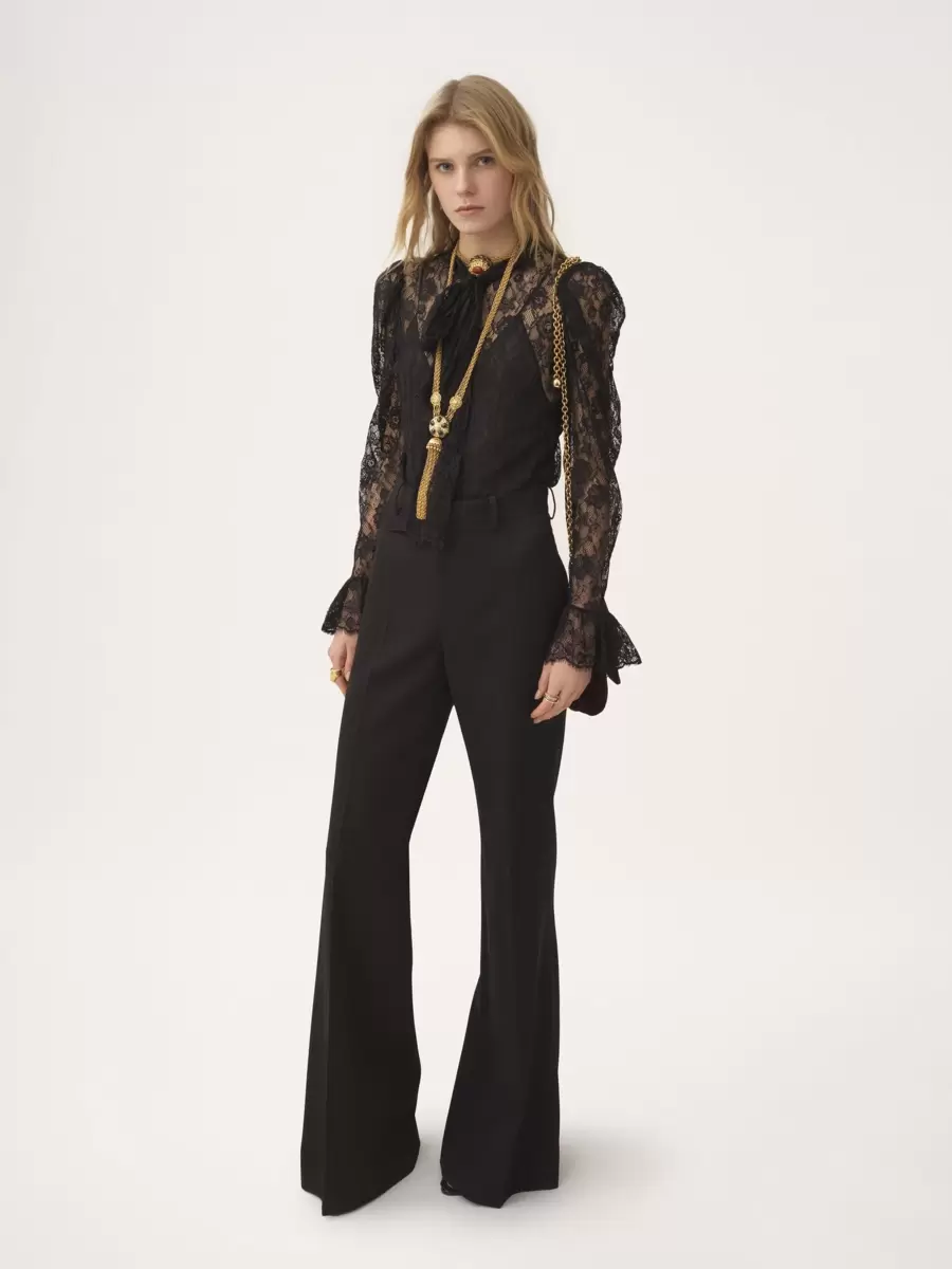 Long-sleeve lavallière top in floral lace jacquard with a separate silk-mix tank top lining. Puff shoulders, flared cuffs and mother-of-pearl buttons finish this piece.
